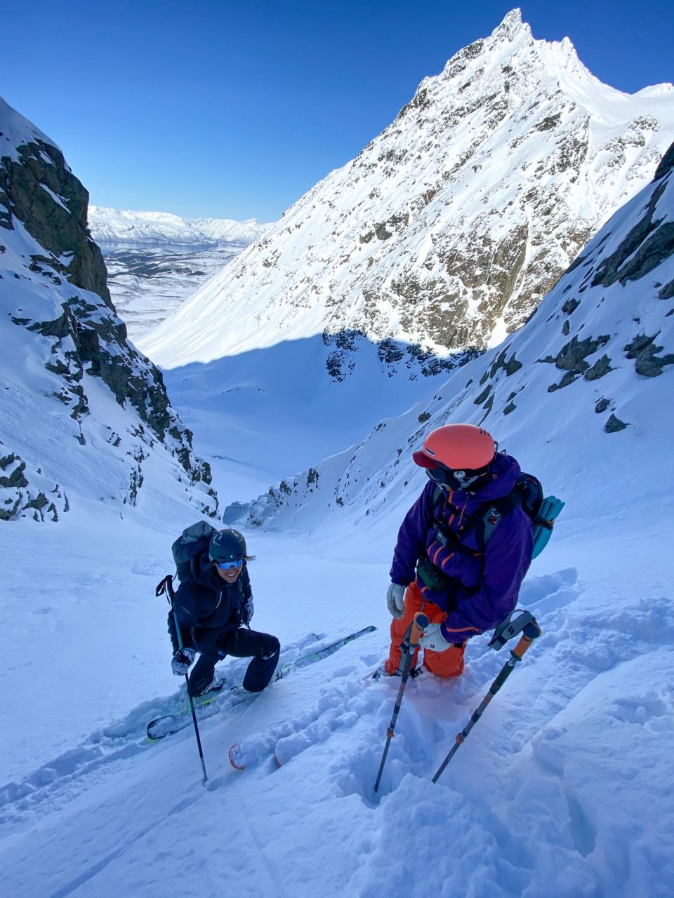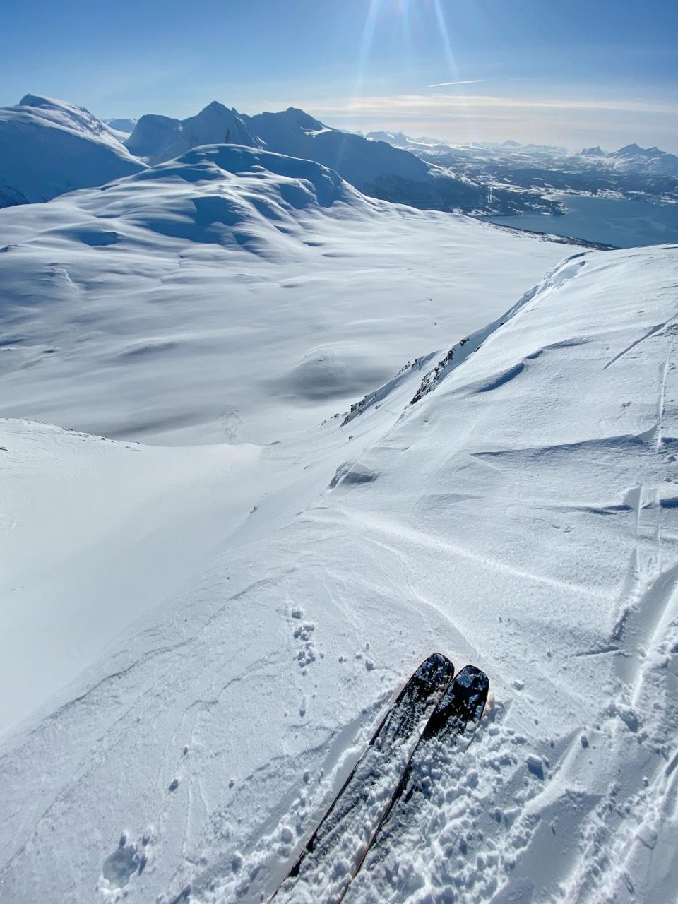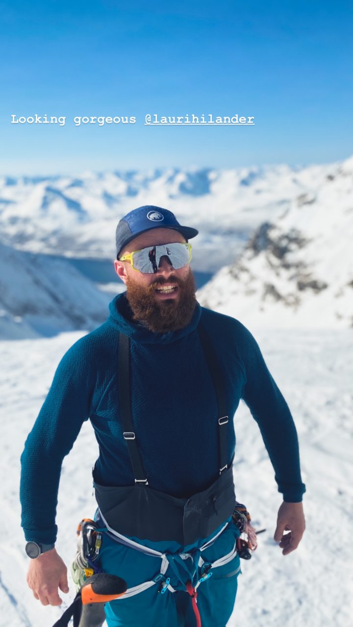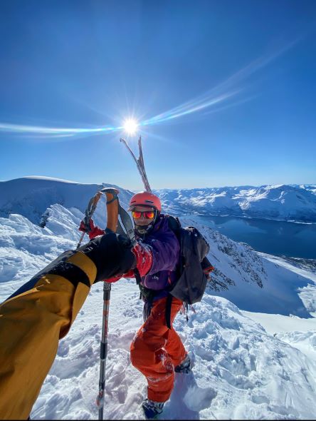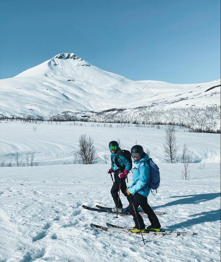 Terkut lukijoille pohjoisesta! Alppien jälkeen suuntasimme tänne muutaman välipysähdyksen kautta suhteellisen rivakasti. Poikkeuksellisen hyvät keli- ja lumiolosuhteet Norjassa olivat täyttäneet oman kuplan uutiset jo pidemmän aikaa, joten hiitti & stoke olivat korkealla! Ensimmäisenä mäkipäivänä kävimme Jonnan kanssa pikaisella iltarandolla ja muistelimme miten randokamoilla laskettiin. Illalla suuntasimme Nordkjosbotniin yöksi, jossa Blumi ja Jedi koira odottelivat iloisena vastassa. Seuraavalle päivälle oli suunniteltu hyvännäköistä jyrkähköä bowlia Lyngenin eteläsaarella. Parkkiksella tapasimme myös uuden tuttavuuden, Roope Avelan ja vietimme yötä autoissa. Pakkasta oli yöllä noin -15 astetta ja itsellä oli rikollinen olo herätä lämpimästä asuntoautosta vs. Roopen ja Blumin heräämiseen kylmästä autosta. Lähdimme aamutoimien jälkeen mäkeen ja Jonna tuli vahvistamaan ryhmää jääden nautiskelemaan hieman loivemmasta kentästä alempana.
