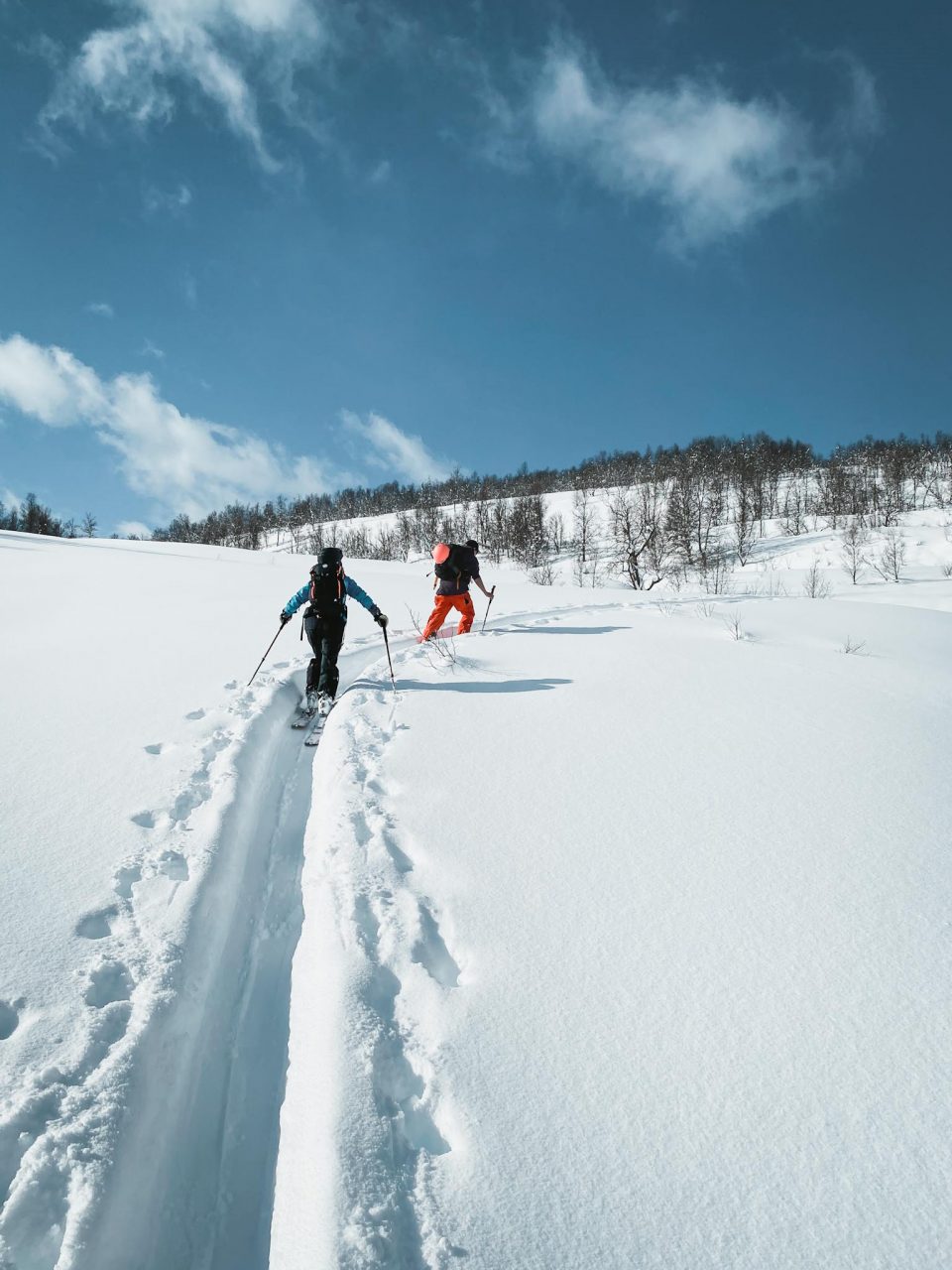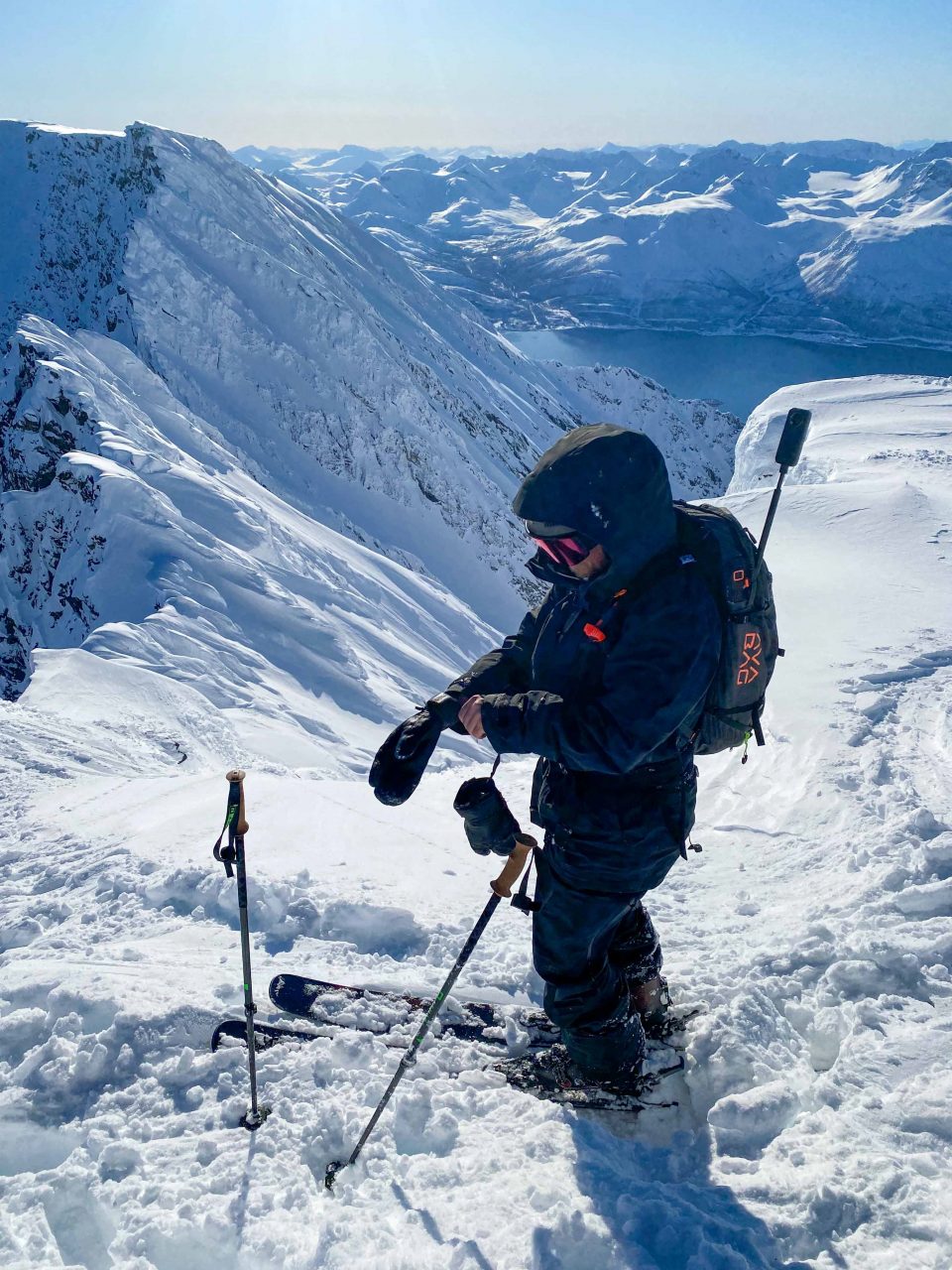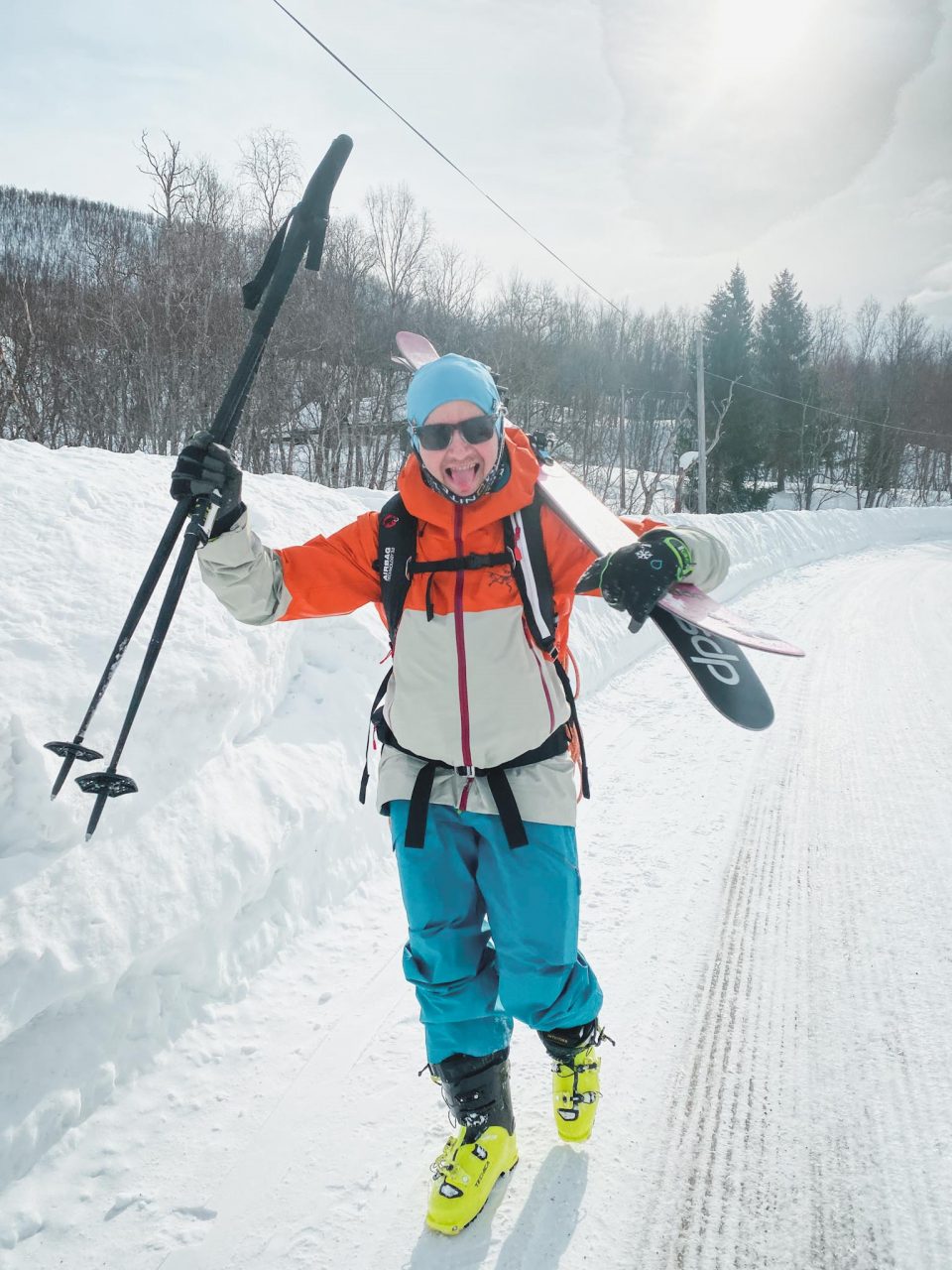 Terkut lukijoille pohjoisesta! Alppien jälkeen suuntasimme tänne muutaman välipysähdyksen kautta suhteellisen rivakasti. Poikkeuksellisen hyvät keli- ja lumiolosuhteet Norjassa olivat täyttäneet oman kuplan uutiset jo pidemmän aikaa, joten hiitti & stoke olivat korkealla! Ensimmäisenä mäkipäivänä kävimme Jonnan kanssa pikaisella iltarandolla ja muistelimme miten randokamoilla laskettiin. Illalla suuntasimme Nordkjosbotniin yöksi, jossa Blumi ja Jedi koira odottelivat iloisena vastassa. Seuraavalle päivälle oli suunniteltu hyvännäköistä jyrkähköä bowlia Lyngenin eteläsaarella. Parkkiksella tapasimme myös uuden tuttavuuden, Roope Avelan ja vietimme yötä autoissa. Pakkasta oli yöllä noin -15 astetta ja itsellä oli rikollinen olo herätä lämpimästä asuntoautosta vs. Roopen ja Blumin heräämiseen kylmästä autosta. Lähdimme aamutoimien jälkeen mäkeen ja Jonna tuli vahvistamaan ryhmää jääden nautiskelemaan hieman loivemmasta kentästä alempana.