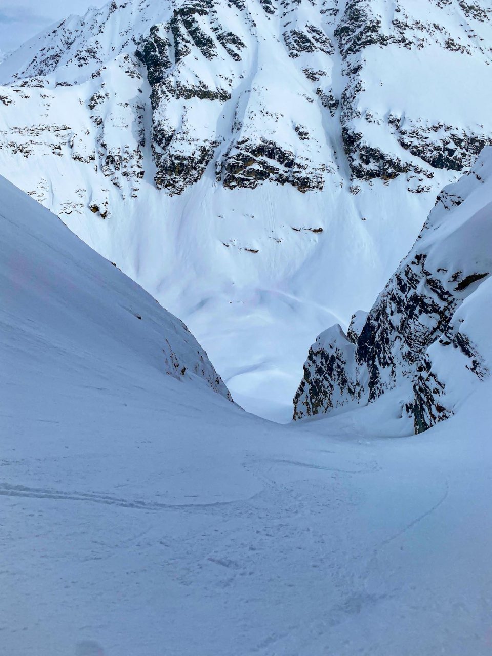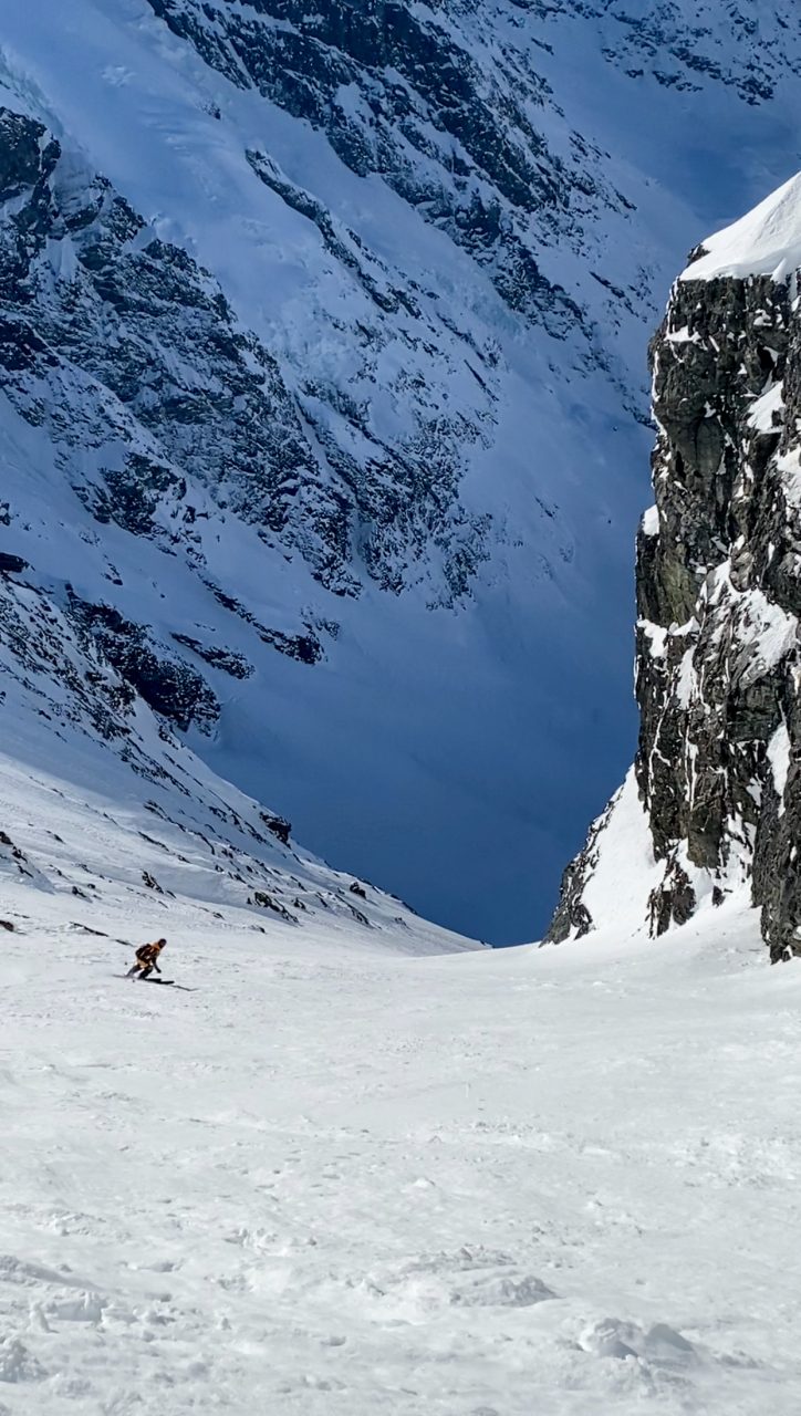 Päätimme topista lähteä katsomaan mäkeä ja se näytti hyvälle. Alussa oli pieni alaspäin kiipeily ja edessä odotti 900 vertikaalimetriä hienoa ränniä. Mitään pyydafestivaalia ei ollut luvassa, mutta pinta oli hyvin laskettavaa hardpackkia.