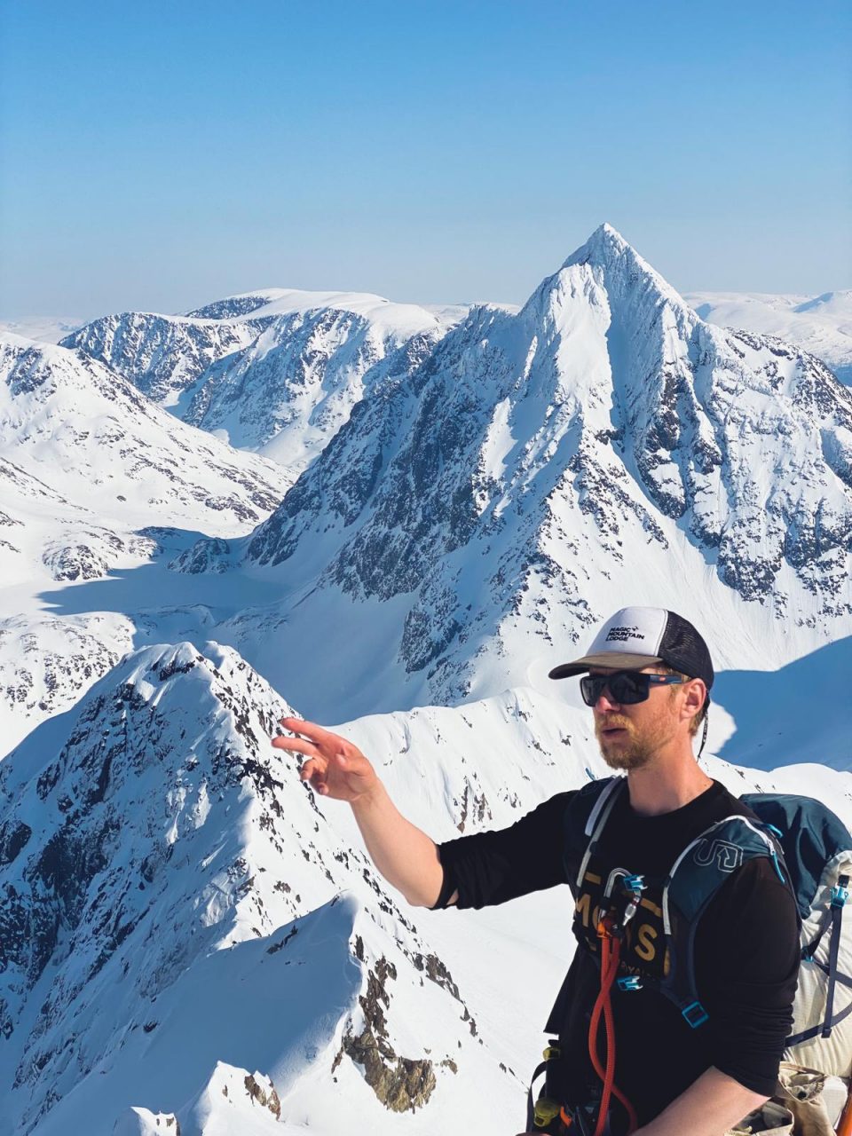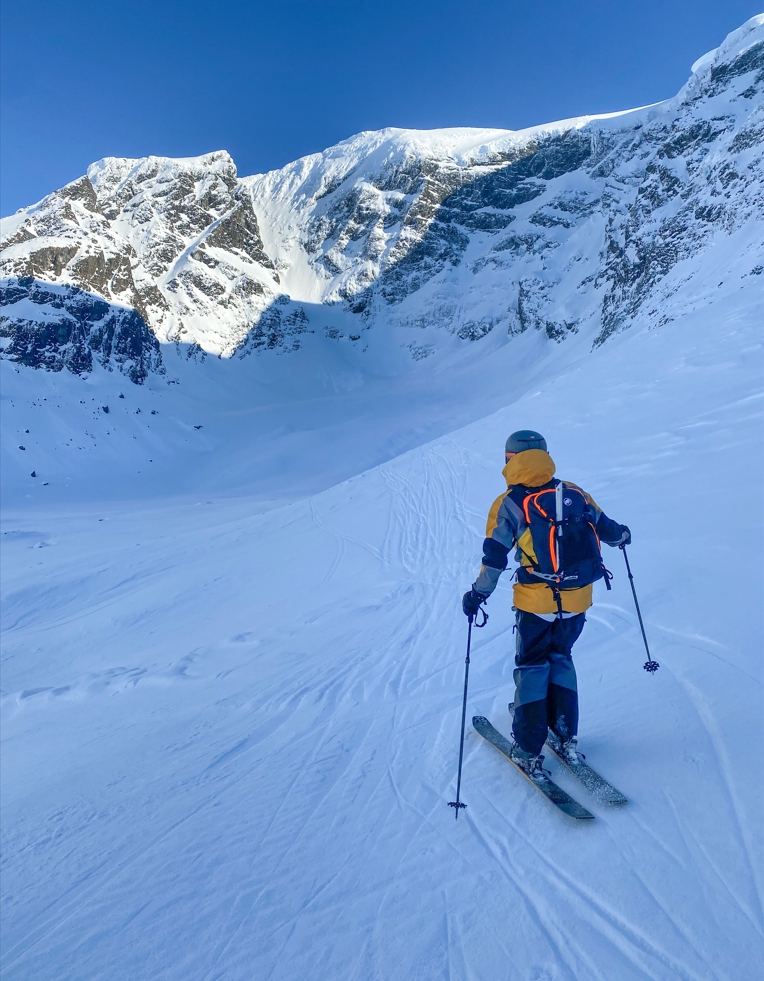 Reilu 1600 metriä verttiä ja puoleen väliin asti ladun avaamista tuntuivat kyllä jaloissa. Onneksi Alpeilla ehdittiin loppureissusta saada edes vähän nousumetrejä kasaan lihasvoimin. Laskun alkuun sai kikkailla vähän harjanteella, mutta navigointia helpotti se, että paikallinen laskija Eivind Aanensen oli kaverinsa kanssa käynyt samoilla pelipaikoilla edellisenä päivänä.