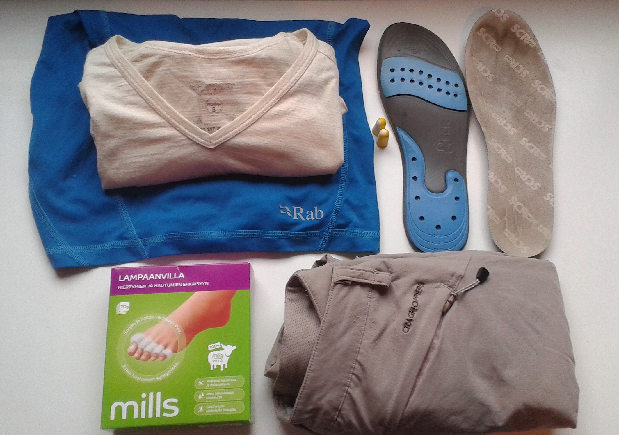 – Pehmeät vaihtopohjalliset – nämä tarttuivat mukaan matkan varrelta ja pelastivat jalkapohjat säryltä.