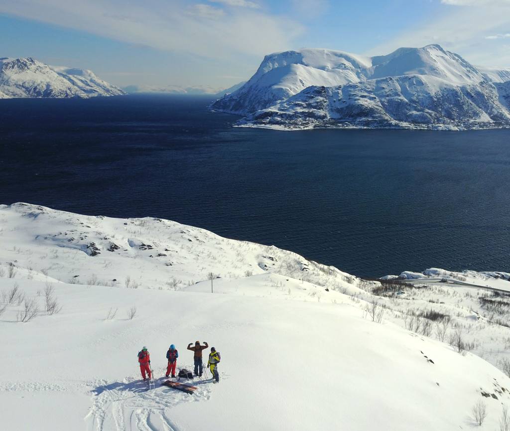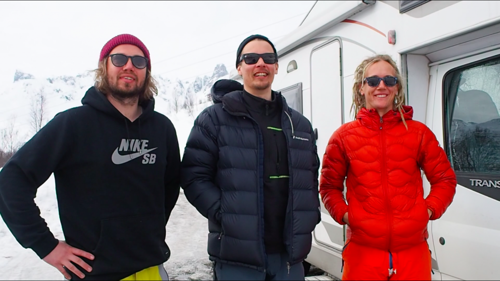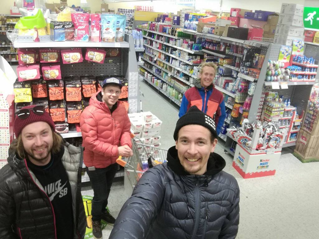 Reissun lauma kasassa! (Oikealta) Guido, Hylje, Orde ja takavasemmalta mukaan hyökännyt Karhumur. Kilpisjärven kauppa ja uusi selfietikku pistää hymyilyttämään! Ostokset karavaaniin ja menoksi, tästä alkaa todellinen tie pohjoiseen.