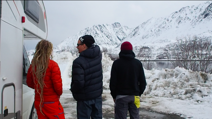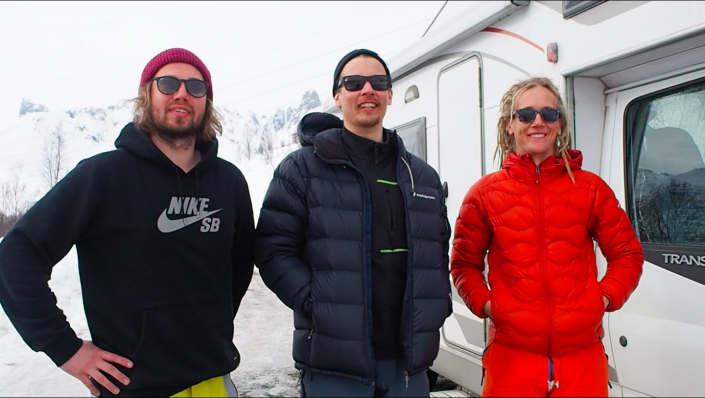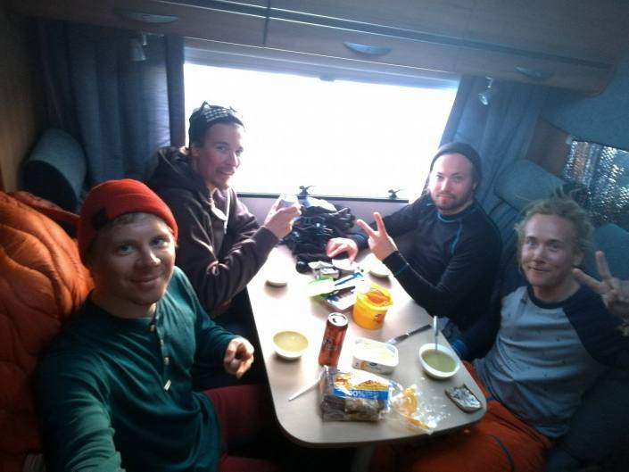 Reissun lauma kasassa! (Oikealta) Guido, Hylje, Orde ja takavasemmalta mukaan hyökännyt Karhumur. Kilpisjärven kauppa ja uusi selfietikku pistää hymyilyttämään! Ostokset karavaaniin ja menoksi, tästä alkaa todellinen tie pohjoiseen.