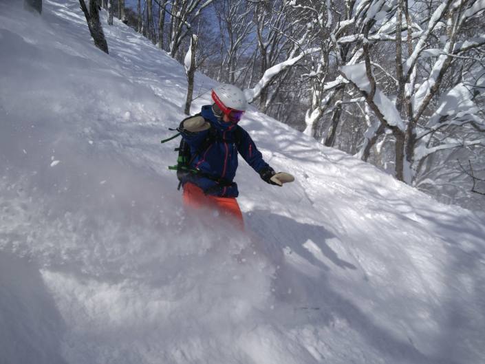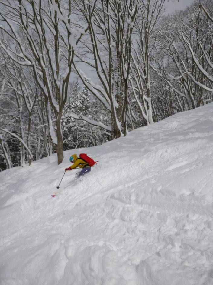 Akakura Kanko semitahkottua huipun metsäpätkää. Onneksi riitti pehmeää edellisen yön sateen (50cm) ansiosta, vaikka hissien vieressä laski joku muukin. Kuva: Riitta