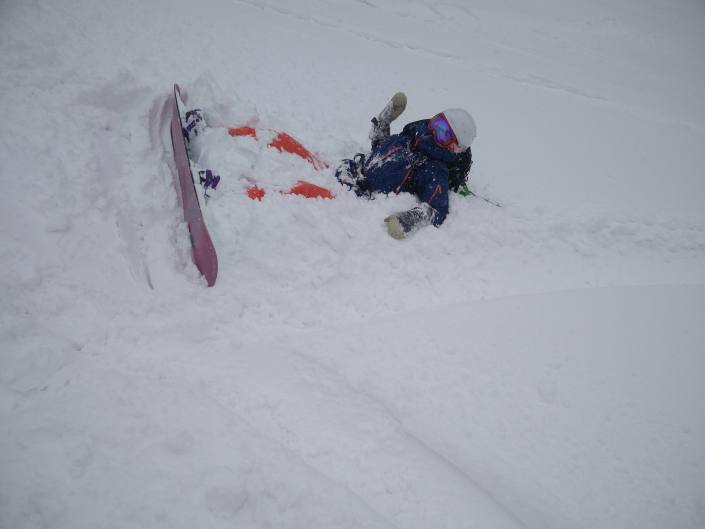 Syvästä lumesta on yllättävän vaikea nousta ylös. Tässä kilpparimoovia esittää Riitta tällä kertaa rinteen puolella.