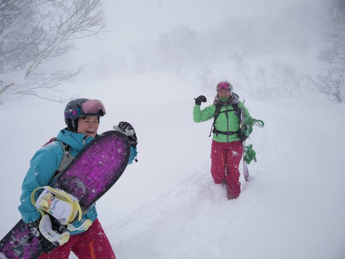 Ensimmäinen kosketus Japanin puuteriin otettiin Nozawa Onsenissa ja kaikki olivat heti myytyjä. Säät suosivat ja lunta satoi koko ajan tai siltä se ainakin tuntui. Kyselemällä ja tutkimalla löysimme todella loistavia pätkiä tuntemattomassa keskuksessa heti ensimmäisenä päivänä. Perustaktiikka oli suunnata huippuhissille ja tsekata sen ympäristöt, sillä vuoret ovat yleensä huipulta jyrkempiä ja loivenevat alas tultaessa. Tosin myös alempana voi laskea jyrkkiä pätkiä kurujen rinteillä. Tähän väliin mainittakoon, että keskitasoinenkin laskija kaipaa jonkin verran jyrkkyyttä, kun sukset uppoavat niin, ettei niitä laskiessa nää. Vaikka spottien löytäminen on ollut suhteellisen helppoa, mihinkään metsään ei kannata laskea tutkimatta kunnolla maastoa, koska edessä voi olla “maybe an night in forest”, kuten kyltit varoittivat. Kerran kysyessäni neuvoa sopivista ja sallituista metsälaskuista ski patrolilta, sain vinkkien kyljessä yhteisen kielen puutteesta huolimatta varoituksen: “But NO rescue”. Hyvin selväksi tuli myös se, että hissien alla ei missään nimessä saa laskea.