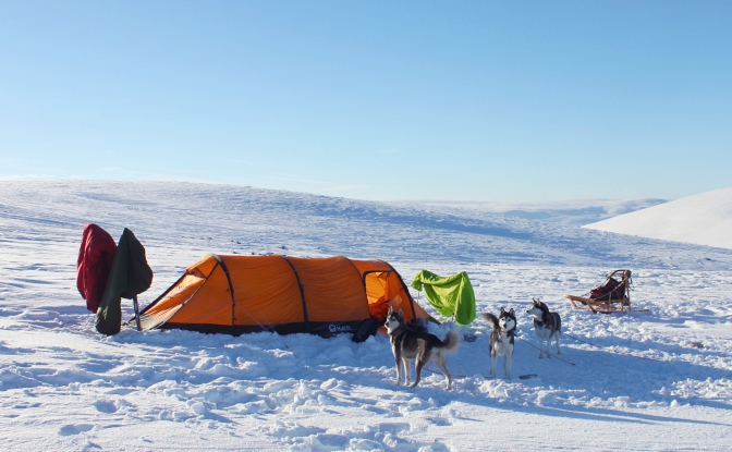 Auringon laskiessa poistuimme merkityltä kelkkareitiltä ja jatkoimme poronhoitajien käyttämiä yksittäisiä jälkiä pitkin, sillä hanki kantoi vain ylempänä tunturissa. Leiriydyimme lähelle tunturin huippua ja seuraavana aamuna meitä odottikin upeat maisemat! Yö oli epäilyttävän tyyni, pidimme teltan ulko-oven auki koko yön ja absidin raollaan olevasta ovesta pystyin seuraamaan koiria koko ajan. Lumi oli teltan ympäristössä hyvin pehmeää ja vähäistä ja löysin vain yhden kohdan, johon koirien tarvitsemat paalut ja vaijerit sai kiinni. Siksi koirat olivat lähempänä toisiaan kuin niiden olisi hyvä olla (vaijerit menevät solmuun, eikä niitä voi jättää vahtimatta). Yöllä telttaa ravisteli kaksi tuulenpuuskaa ja sitten oli taas täysin hiljaista. Revontulet ja kirkas kuu valaisivat niin, ettei pimeää hetkeä tullut koko yönä.