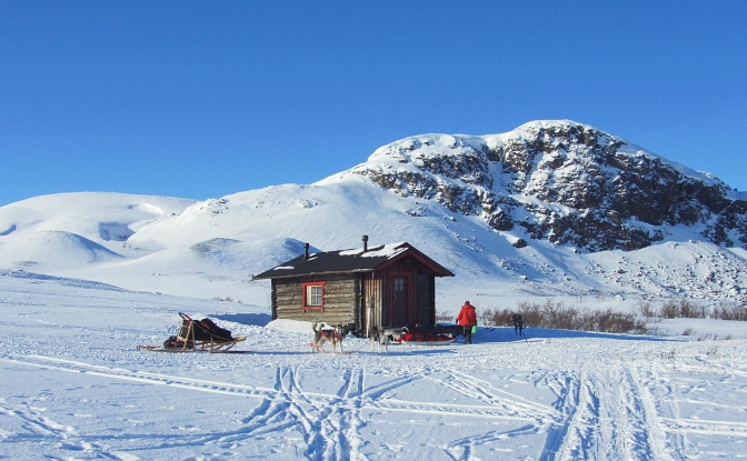Lähdimme lauantaina Kilpisjärveltä kelkkareittiä pitkin kohti Saarijärveä. Jo ihan kirjaimellisesti ensimetreillä täytyi suunnitelmaa kuitenkin muuttaa, sillä Sanni sairastui sopivasti juuri lähtöpäivänä. Liikkeelle pääsimme vasta pitkälti iltapäivän puolella ja meidän piti kiertää Norjan kautta oikaiseva reitti pidemmän ja korkeammalle nousevan reitin kautta. Kilpisjärvi-Halti-väli on kesäreittiä pitkin 53 km yhteen suuntaan, talvireitti lienee hieman lyhyempi. Jo alkumatkasta tikutettu huoltoreitti kulkee n. 2 km matkan Norjan puolella, mikä on ongelma koirien kanssa liikkuessa. Minulla oli passi vain yhdelle koiralle, joten suunnitelimme alunperinkin kiertävämme tuon Norjan osuuden.
