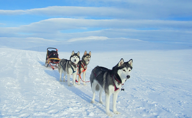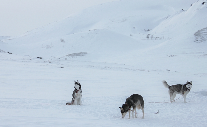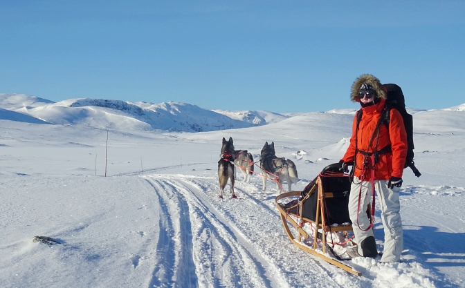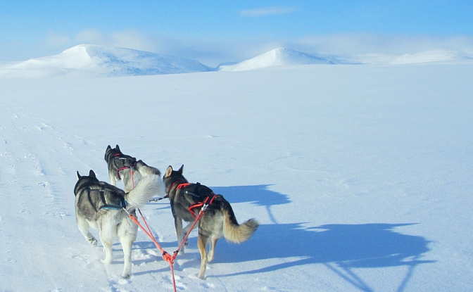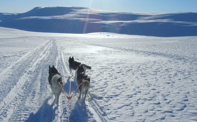 Huomasin kummallisen käytöksen nyt 9-vuotiaassa Odessa-rouvassa ensimmäisen kerran Saariselällä kun se näki avotunturista kaukana ajavia autoja. Aivan kuin sillä naksahtaisi päässä ja sen metsästyskäyttäytyminen iskee täysillä päälle. Nyt sama kävi kun se näki Haltille suuntaavan kelkkasafarin. Odessa ei pysty hahmottamaan etäisyyksiä puuttomassa, valkeassa maisemassa ja kuvittelee näkevänsä pakenevia eläimiä! Kun kelkat ajavat vastaan Odessa ei välitä niistä lainkaan, mutta vaikka se näkisi samat kelkat kaukana takana pieninä pisteinä se sekoaa jälleen. Ja niinhän siinä kävi, että koirat syöksyivät “poroja” kohti ja juuri tyhjentämäni reki ei niitä paljoa pidätellyt. Ehdin juuri tarttua ohjauskaareen kiinni ja jarruttaa ennen kuin koko lauma lähti “porojahtiin”. Tällaiset vaaratilanteet pitäisi aina osata ennakoida, jo terävän lumiankkurin kanssa voi joutua todellisiin ongelmiin ja koirien ja reen käsittelyn tulee olla aina hallittua.