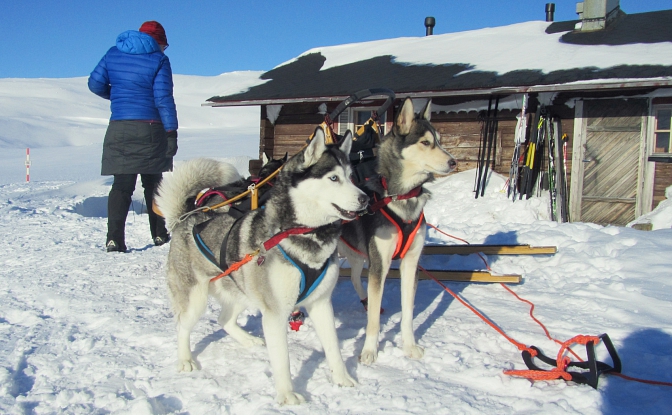 Matka Pitsusjärveltä Haltin juurelle on lähinnä loivaa nousua ja odottelin taas hiihtävää kaveria, jolloin koirat saivat säännöllisiä lepotaukoja. Vaikkeivat ne niitä olisi tarvinneetkaan. Tietämättäni olimme psyykanneet takanamme hiihtävää itävaltalaista kovaan vauhtiin, sillä hän kommentoi perillä luulleensa hiihtävänsä valjakkoa nopeammin. Nauroin, että juu hyvää vauhtia hiihdit, mutta pysähdyin aina odottelemaan sairastelevaa kaveriani. Hän osoittautuikin oikein mukavaksi tupakaveriksi, joka tarjoili itävaltalaisia rohtoja ja rekikoiraharrastajana tuntui myös nauttivan koirien seurasta.