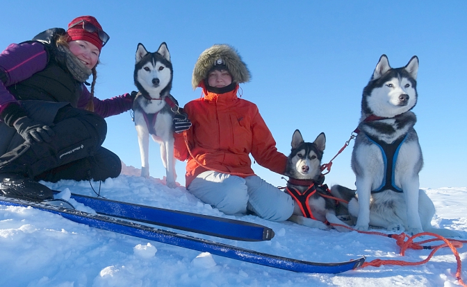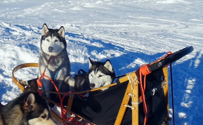 Tyhjensin reen ja pidimme lyhyen tauon Haltin uudella tuvalla. Sää oli taas aurinkoinen ja ura oli ihan hyvässä kunnossa, vaikka puolen päivän jälkeen aurinko pehmentääkin rinnettä jonkin verran. Ehkä suurin moka tapahtui huipulle lähtiessä. Yllä olevasta kuvastakin näkee, että olen ankkuroinut reen väärään suuntaan. Pysähtyessä reki ankkuroidaan ja liinat irrotetaan koirien valjaista ja ne laitetaan kiinni kaulapantoihin. Kaulapannoilla koirat eivät jaksa vetää ankkuroitua rekeä irti, jolla on kuorman kanssa painoa n. 70-100 kg. Koirat vaikuttivat rauhallisilta, ne hauskuuttivat varaustuvan tšekkiryhmää kiipeämällä rekeen istumaan, jolloin niistä sai otettuun hauskoja kuvia.