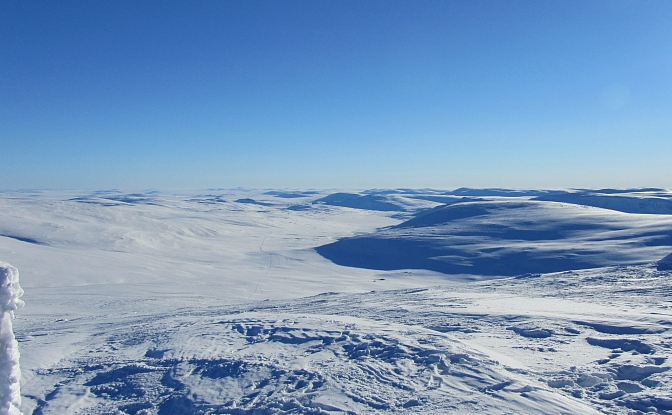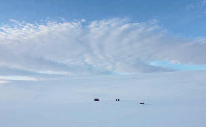 Suomen huippuhan ei varsinaisesti ole mikään huippu, vaan Suomen korkein kohta sijaitsee Haldičohkka-sivuhuipun rinteessä Norjan rajalla. Norja voisi laittaa tuon tunturin pakettiin ja lahjoittaa sen kokonaan Suomelle 100-vuotisjuhlan kunniaksi. Norjalla on ihan oikeita vuoriakin, joten yksi loiva tunturi kyllä joutaisi meillekin. Suomen korkeinta kohtaa merkitsevä rajapyykki 1 323,6 metrin korkeudessa oli lumen peitossa, emmekä viitsineet edes kirjoittaa nimiämme Haltin vieraskirjaan, joka löytyi aivan rajapyykin vierestä. Olimmeko koirien kanssa rikollisilla teillä Norjan puolella, edes yhden tassun verran -sitä en tiedä. Toivottavasti emme. Rajalla kyllä partioidaan ja kohtasimme poliisinkin Haltille noustessa. Ylemmässä kuvassa näkyy maisema Suomen puolelle, kuvassa näkyy Haltin molemmat tuvat ja Pitsusjärvelle menevä reitti. Sanni kävi vielä lähettämässä Spotin ok-viestin sivuhuipulta ja lähdimme laskeutumaan.