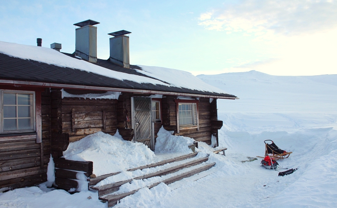 Yöllä heräsimme tupaa kolistelevaan tuuleen. Kävin ensin hakemassa rekipussista koirien valjaat sisälle, olisi ikävää jos tuuli nappaisi ne mukaansa. Tuuli tuntui vain nousevan jo ihan kunnon lukemiin, joten menin vielä siirtämään reen parempaan suojaan ja ankkuroin sen kunnolla paikalleen. Ajattelin, että lähes tyhjä rekipussi muodostaisi hyvän purjeen ja rekikin lähtisi myrskytuulessa omille teilleen. Tuuli tuntui kunnolla ja näytti hauskalta kun revontulet liehuivat kuin tuiskuttaen vihreää lunta ympäröivien tuntureiden huipuilta. Sen suurempia myrskyjä emme kokeneetkaan koko reissun aikana.