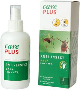 Care Plus DEET Spray Anti-Insect on saatavilla 60, 100 ja 200 ml pakkauksissa. Karkotteen sisältö on n. 40% DEET + 60% etanoli ja tämä suojaa hyttysiltä n. 8h ja punkeilta n. 4h. Käytä korkeintaan kerran vuorokaudessa. Ei alle 13-vuotiaiden iholle.