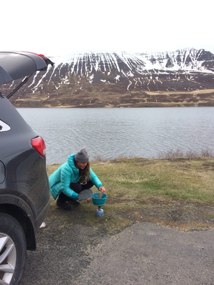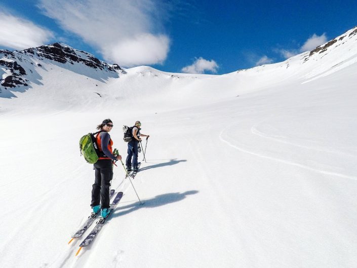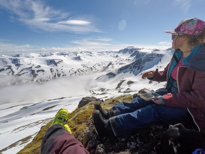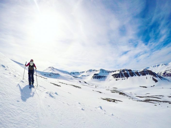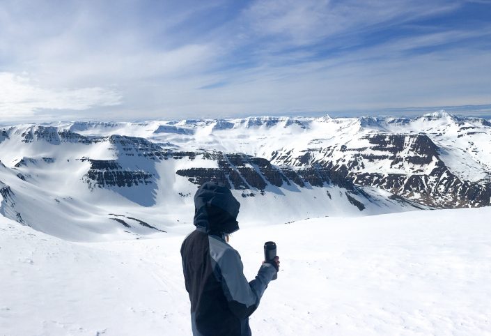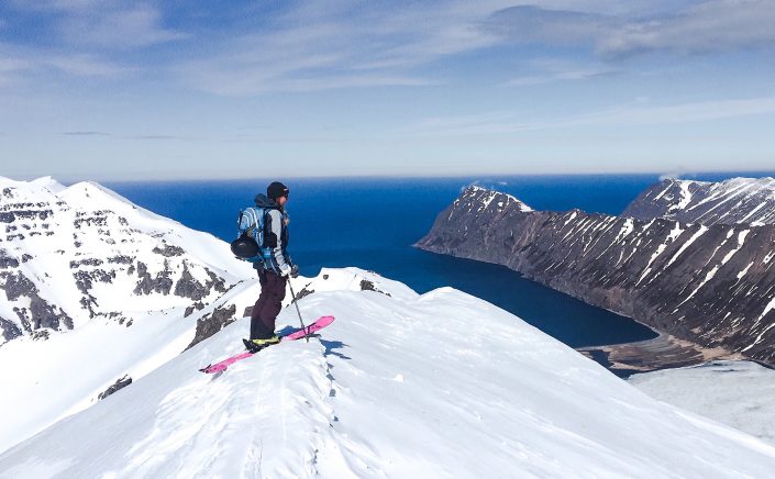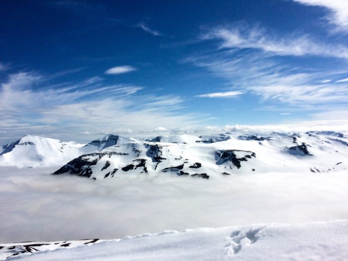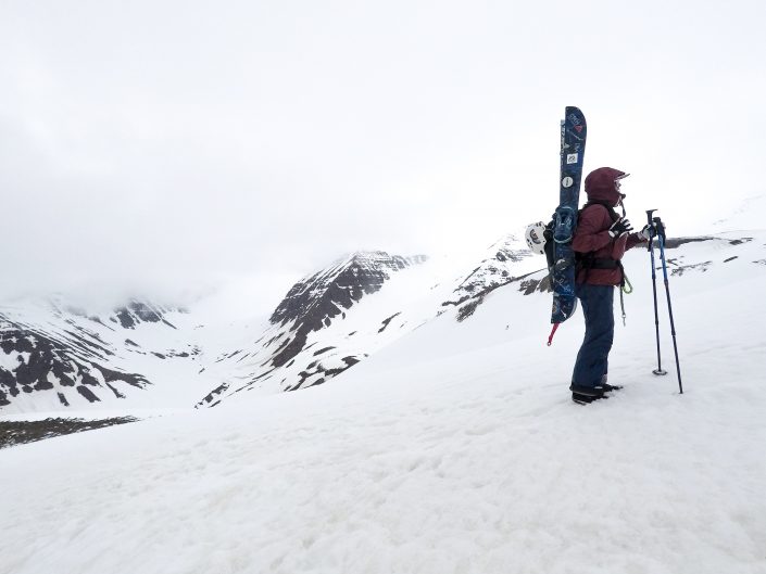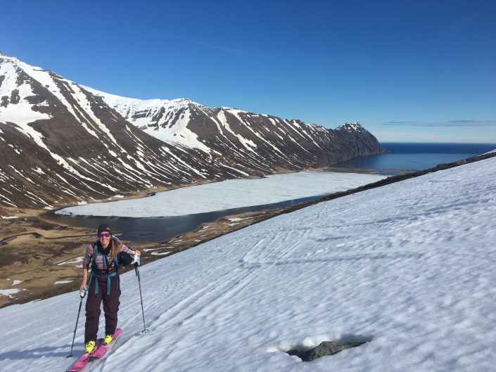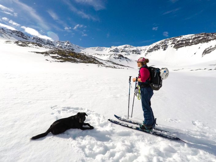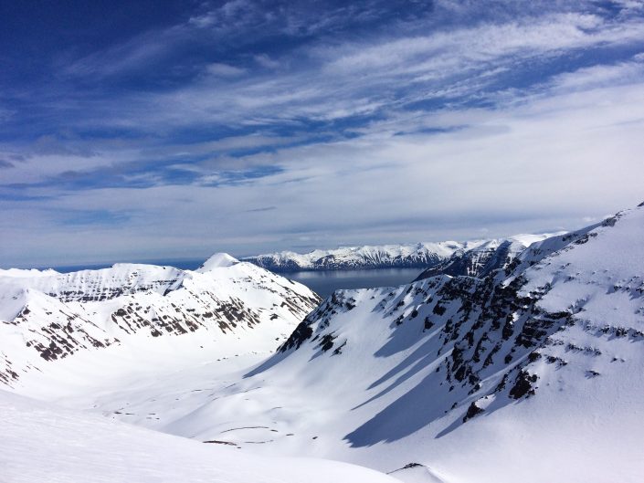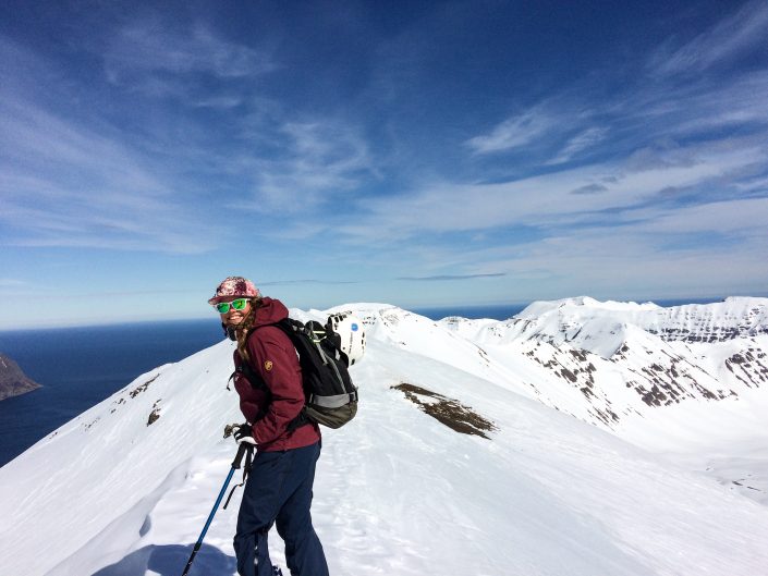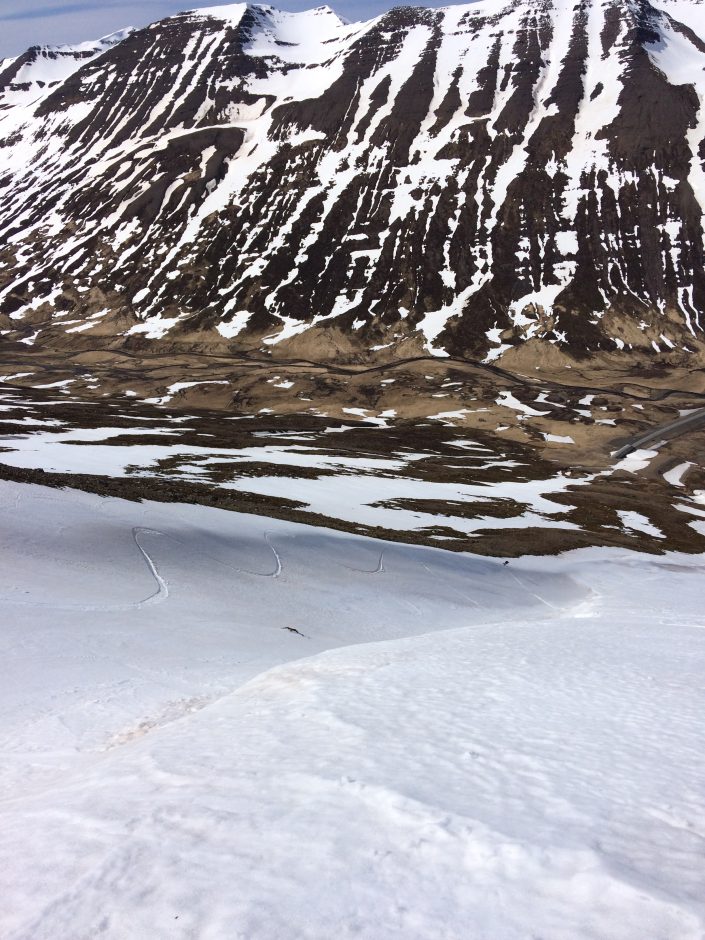 To get around in the Northent part of Iceland it’s almost a must to have a car since the public transportation is not that great. So we had a rental car during my stay. We didn’t have any bigger plans, the spring weather can be really variable so it was nice to take it day by day and go with the weather and feeling. We were really lucky and got some sunny days as well, definitely not that common in Iceland! As it was late spring we started early in the morning and skied mostly north facing sides. We spent the whole time in Trollaskagi Peninsula, there’s an endless amount of beautiful and great mountains to ski there! The highest ones are around 1,400 vertical meters so the hikes up were not that long but we still got long runs to ski down. In most of the places we were also the only people to be seen around. One day we met a few other skiers next to the road and after a little chat it came out that one of them used to work for the same heliski company at the same time with Lisa in Canada. The world of skiing is really small 😀