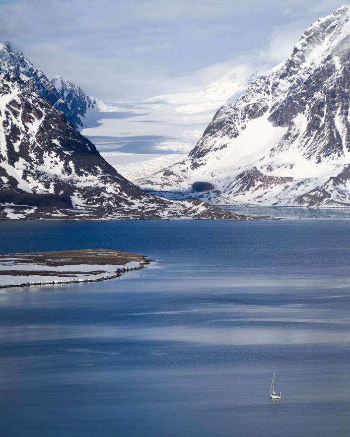 Kotini s/y Sylvia ankkurissa. Lunta riittää! Taustalla Mayerbreenin jäätikkö, joka on Svalbardissa vielä aivan pikkupoikien kokoluokkaa.
