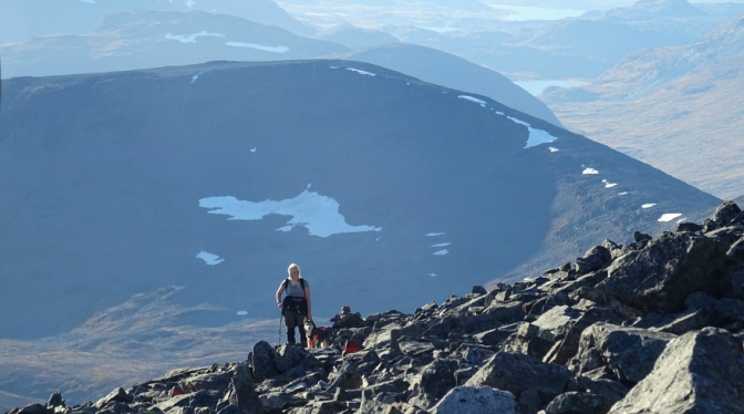 “Kebnekaisen viimeistä rinnettä kiivetessä vastaantulija heilutti käsiä ja sanoi ”No dogs, no dogs top”. Siinäpä sitten ihmeteltiin, minkä ihmeen takia koirien vieminen huipulle on kiellettyä! Lopulta selvisi, että vastaantulija yritti viestittää, ettei huipulta ole enää tulossa vastaan koiria ja voisin päästää omani vapaaksi. Pidän kuitenkin aina koirani kytkettynä, ne ovat vetoapua ylämäessä ja alas tullessa ne on koulutettu kulkemaan takanani.” Alempi kuva Sanni Rannikko.