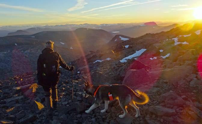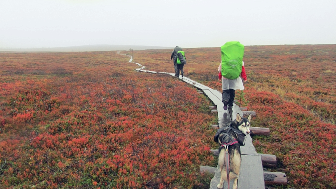 Reitti on suunniteltava koiran ehdoilla. Päivämatkojen on pysyttävä koiralle kohtuullisina ja maaston koiran kunnon mukaisena. Minulla oli Vega-koirani mukana Kebnekaisella, joka on jo sellaista maastoa, että se vaatii koiralta kovaa kuntoa ja ketteryyttä, jolloin koira on tottunut liikkumaan vaikeassa maastossa. Joillakin reiteillä on riippusiltoja, ylityslauttoja tai vaijeriylityksiä ja koira saattaa joutua uimaan ylitykset tai se on kannettava esim. reppuselässä. Itse en jätä koiraa koskaan valvomatta esim. huiputusten ajaksi. Leiriin jätetty koira voi karata tai vaikka kohdata irtokoiran. Vuodenaikaa on myös hyvä miettiä, kesällä on monelle koiralle liian kuuma ja varsinkin Lapissa riittää hyttysiä, mäkäriä ja polttiaisia, jotka vaivaavat yhtälailla sitä karvaista kaveriakin.