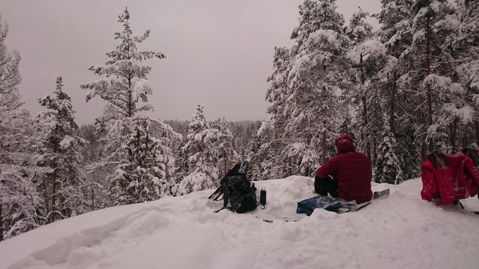 Folioitu solumuovialusta on erittäin hyvä, koska sen päällä tarkenee istua hangessakin. Eristää siis kivasti. Juomapulloni on Klean Kanteen -merkkinen 0,8L teräspullo, joka sauvojen tapaan alkaa olla jo luottokaveri reissuilla. En tiedä olenko ainoa, joka kokee näin, mutta pakkasella vesi teräspullosta maistuu taivaallisesta! Vielä parwmpaa jos sinne on ehtinyt muodostua hieman jäähiutaleita. Aiemmissa postauksissa olen vannonut teräksen nimeen retkeilyastioissa ja siksi siis teräspullo. Taukotakki on mukava, sillä kun saavut taukopaikalle ja olet hiestä märkänä, on kiva heittää kevyt untuvatakki päälle niin vilu ei pääse yllättämään sillä aikaa kun kuoritakki päästää höyryjä vaellussauvojen päällä.