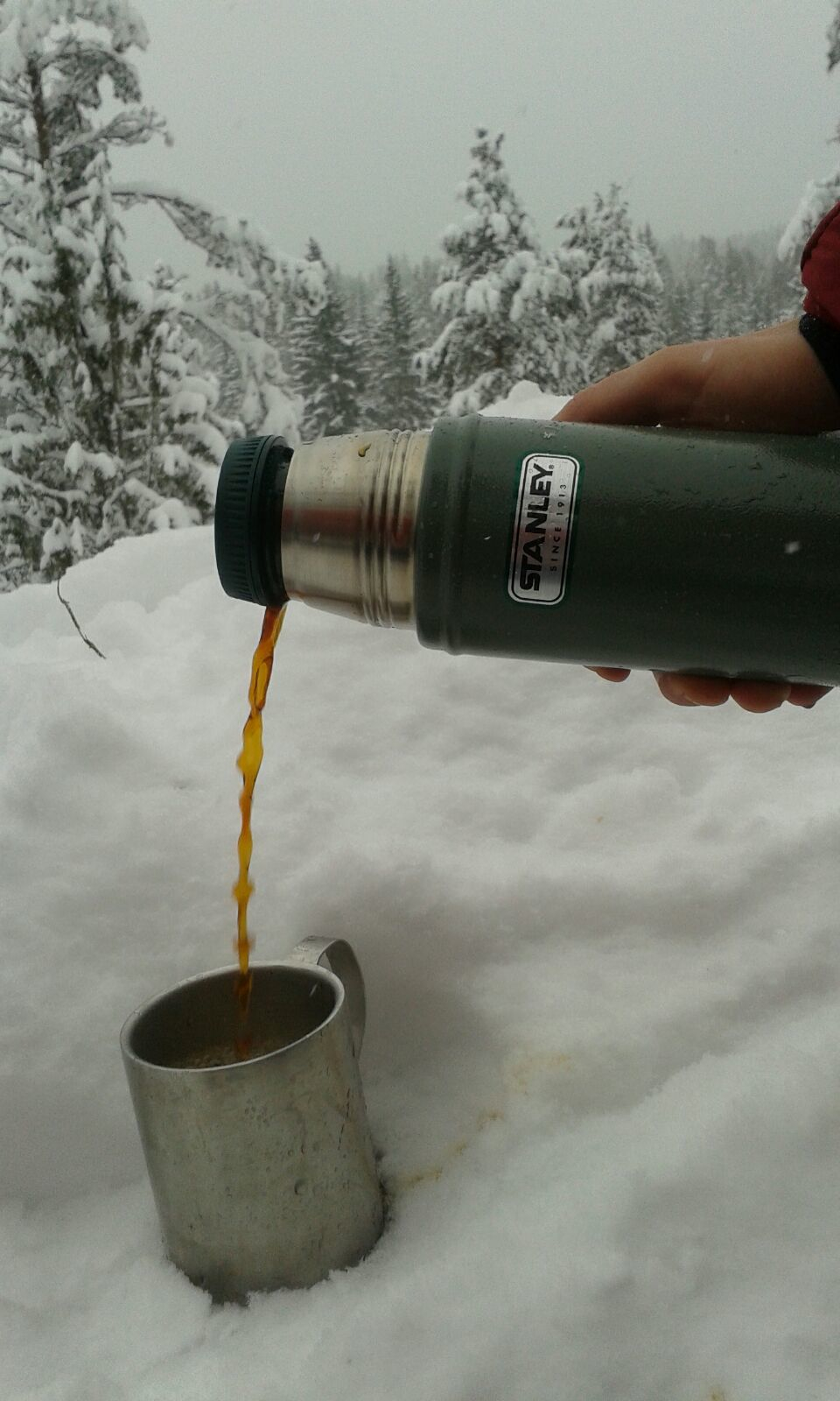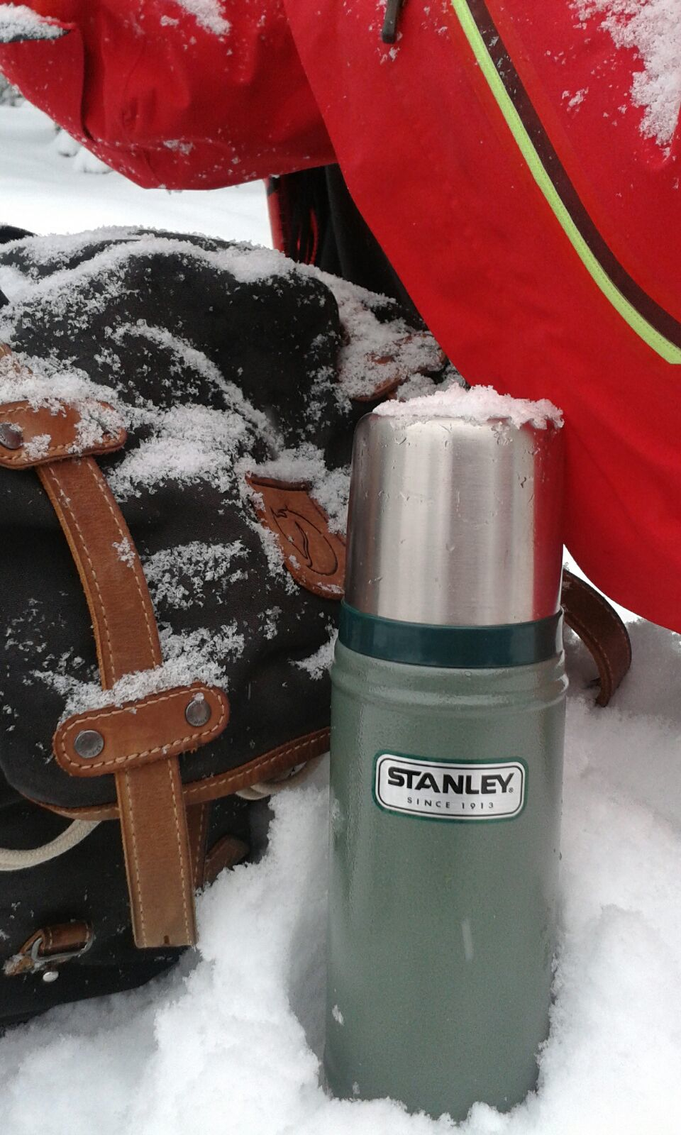 Stanleyn termospulloa on pakko mainostaa hieman. PARAS MITÄ KOSKAAN OLEN OMISTANUT! Termospullo pitää kahvit kuumana erittäin kauan myös kovillakin pakkasilla. Yövyin kerran avolaavussa talvella -27 asteessa ja illalla ennen nukkumaanmenoa keitin pulloon kuuman veden. Aamulla n. 7-8 tuntia myöhemmin vesi oli vielä sen verran lämmintä, että siitä sai aamukahvit nautiskeltua. Termospullossa ei ole hienoja painamismekanismeja, jotta kahvin saa sieltä ulos. Siinä on sisä- ja ulkokorkki, jotka kierretään paikalleen. Ja tiiviste pitää, vaikka pullo olisi vaakatasossa repun pohjalla. Ulkokorkkia voi perinteisesti käyttää myös mukina, mutta oma Primuksen kaksikerros teräskuppi on kolmas luottokaverini, joka on aina ollut mukanani.