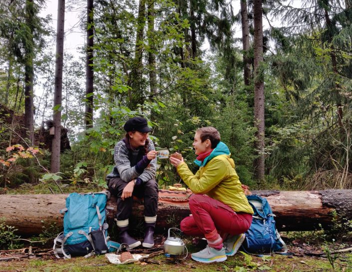 Me koostamme päivien ruuat yleensä niin, että aamiainen on lämmin, tuhti puuro lisukkeilla tai esimerkiksi reilun kokoinen munakas. Lounas valmistetaan aamutoimien yhteydessä termariin ja nautitaan pikaisella lounastauolla. Päivällistä kokkaillaan ajan kanssa ja meillä kuuluu retkeilyyn myös jälkiruuat. Aterioiden lisäksi nautimme välipaloja lyhyemmillä tauoilla. Juotavaa pitää olla saatavilla pitkin päivää ja jokaisella tauolla on hyvä ottaa hörppy vettä. Tällä systeemillä olemme menneet pidempiä ja lyhyempiä reissuja ja energiat ovat pysyneet kohdillaan.