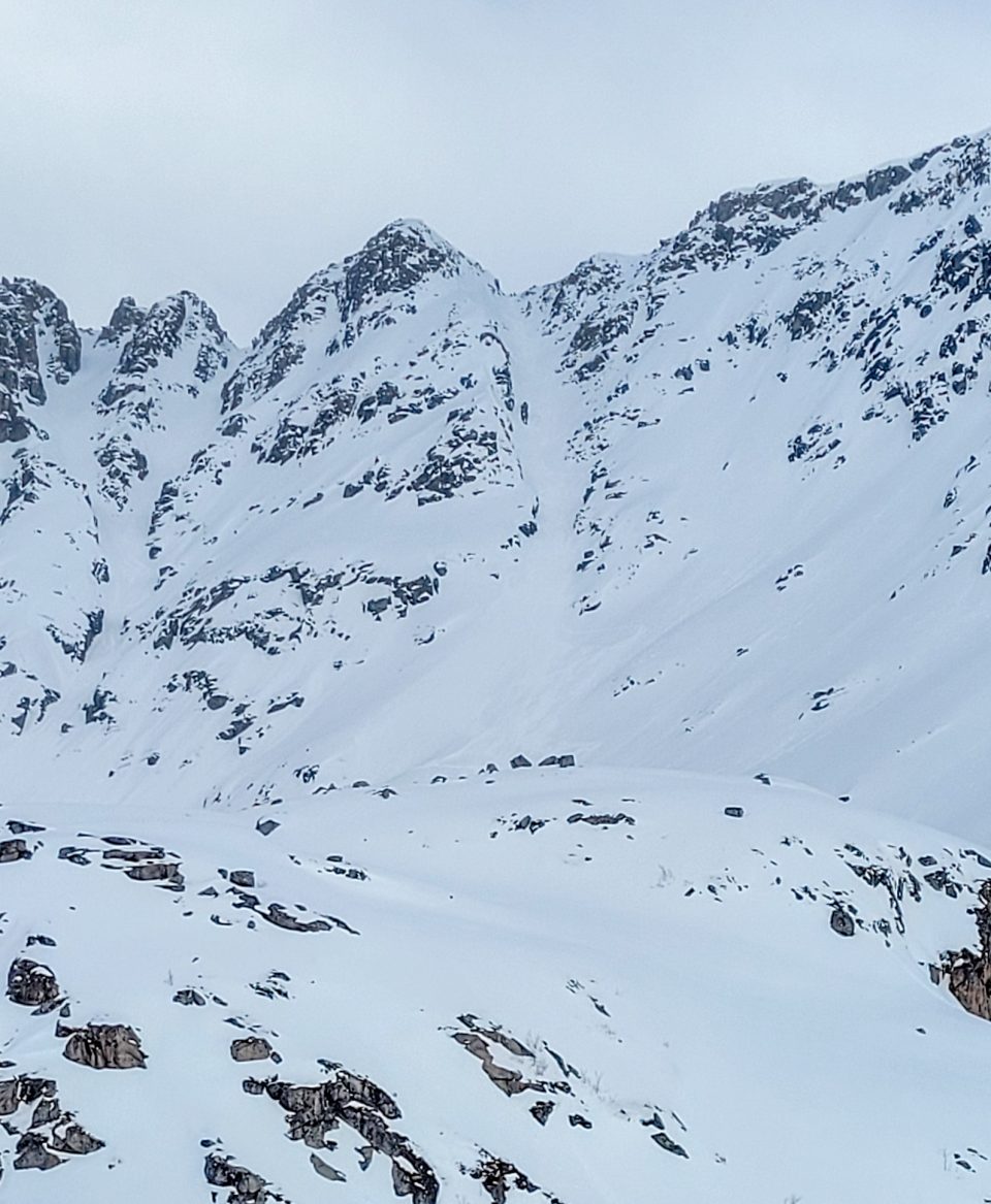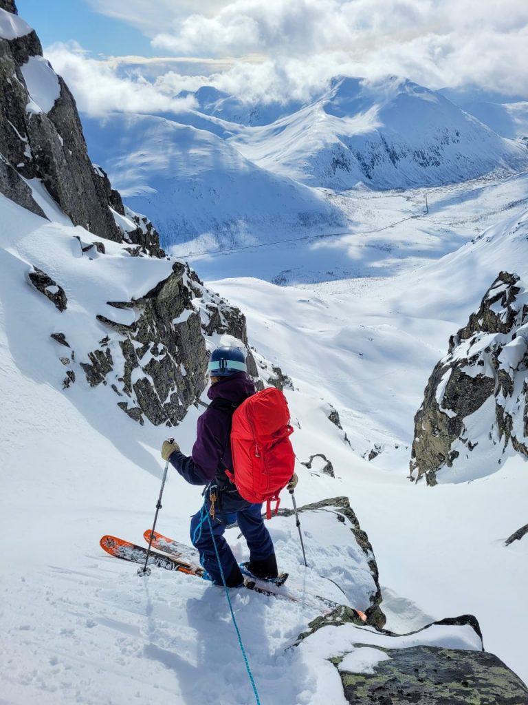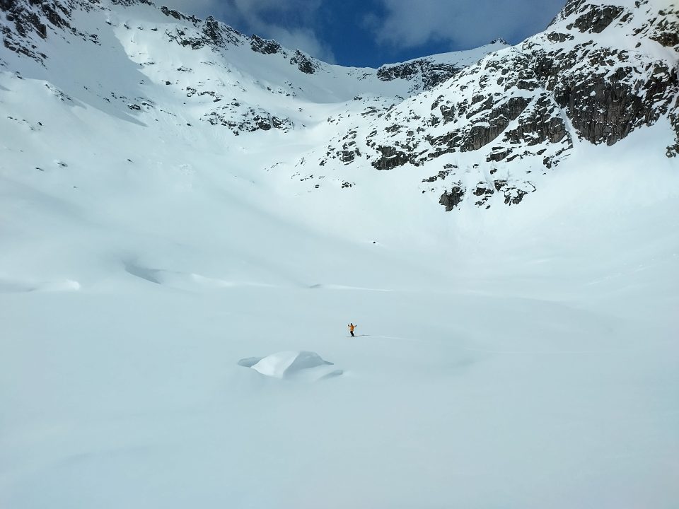 Påsketurin ensimmäinen päivä alkoi aamulla harmillisesti, koska Blumilla oli onneksi nopeasti ohi mennyt vatsatauti. Pääsin kuitenkin mukaan alppinisti Lauri Hilanderin porukkaan. Päivän mäki oli kurulasku Kvaløyan saarella. Parkkikselle kokoontuivat myös paikallispäälliköt Jussi Nurminen ja Jaakko Pellikka sekä hienolla matkailupakulla paikalle tullut Niklas Dahlberg. Parin tunnin skinnaamisen ja harjannekiipeilyn jälkeen valitsimme kaksi ränniä ja jakauduimme niihin. Kulmaa “Rambo” rännissä riitti aivan riittävästi ensimmäisen päivän mäeksi. Lumipakkaa oli myös syytä tarkkailla erityisen tarkasti pysyvän heikon kerroksen takia. Kun lumet oli testattu ja kaivettu, oli ensimmäisen mäen aika ja se oli todella hyvää pyydaa alas asti!