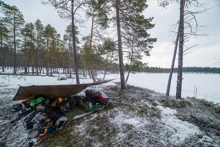 Ensimmäiset “oikeat” talvivaellukset tein vain DD Hammocksin 3×3 -tarppi majoitteena, toki vaellusteltta oli varmuuden vuoksi myös mukana, mutta eipä sitä tullut kertaakaan pystytettyä. Maavaatteena oli 5€ kevytpeite. Tämän tarpin alle mahtuu kaksi ihmistä hyvin varusteineen ja kolme, jos jättää varusteita ulkopuolelle.