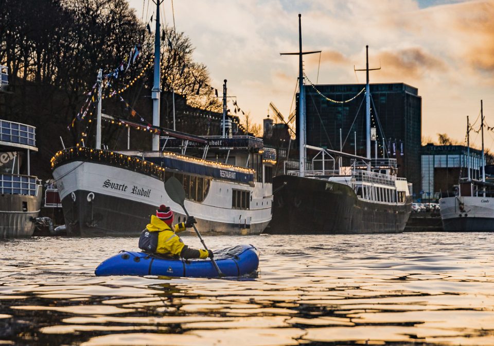 Packraft-melontaa Turun Aurajoella joulukuussa.