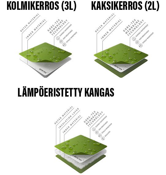 Vaikka vedenpitävän ja hengittävän Gore-Tex-kalvon perusperiaate onkin helppo omaksua, ei asia ole aivan niin yksiselitteinen. Erilaisia Gore-Tex-merkintöjä löytyykin valikoimamme tuotteista paljon erilaisia ja tässä oppaassa käymme läpi niiden erot ja soveltuvuudet erilaisiin aktiviteetteihin.