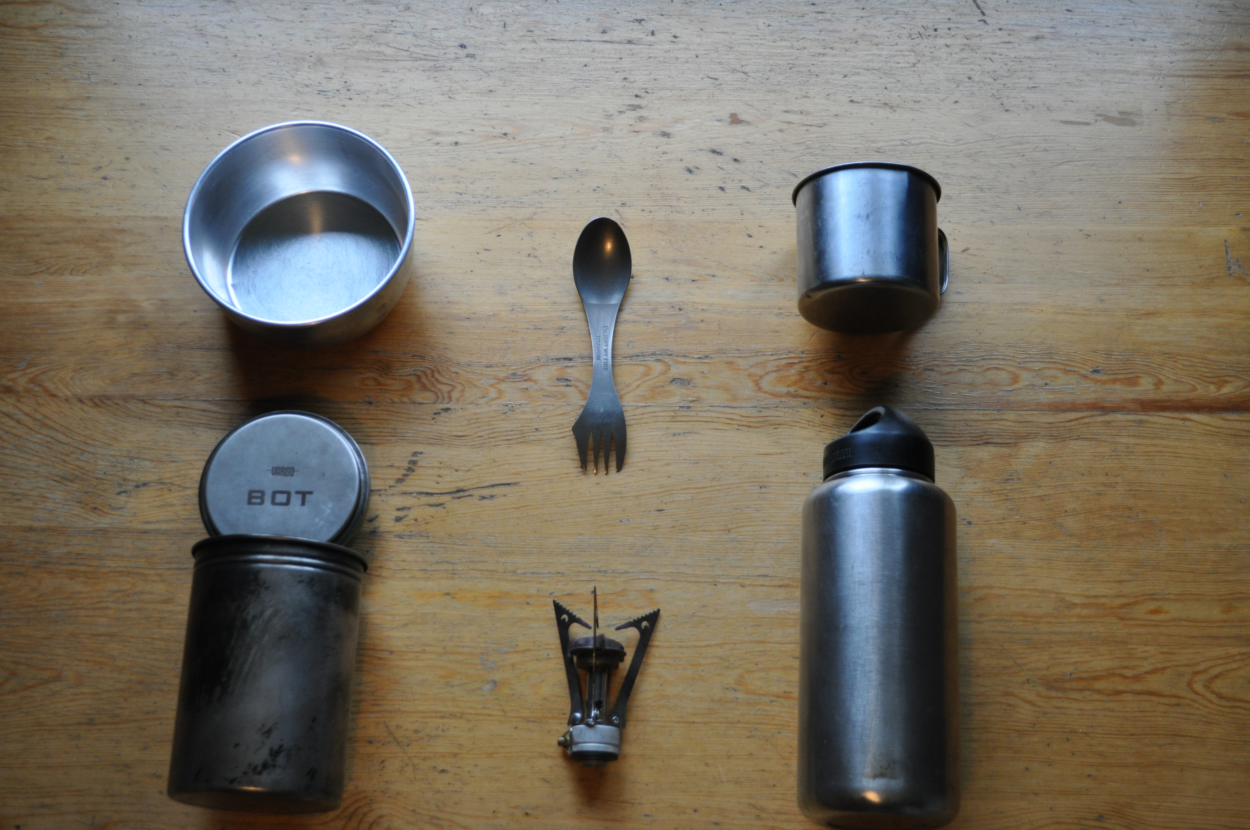 Seuraavaksi kokkaaminen. Tästä olenkin jo kirjoitellut useaan otteeseen ja ylistänyt materiaaleina terästä. Tulevalle reissulle joudun ottamaan yhden alumiinikattilan ylimääräisenä, mutta yleensä kuvasta puuttuisi vasemmassa yläkulmassa oleva kattila. Light My Fire titaani spork on näppärän pieni ja kevyt lusikkahaarukka yhdistelmä. Muki kahville, sekä n. litran vetoinen juomapullo. Vargon valmistama BOT on toiminut minulla yleensä kattilana sekä syömäastiana. Kuvasta puuttuu vielä kaasupullo, mutta yksin jos lähtisin, riittäisi minulle 450g kaasupullo. Sitten jos sattuisi niin, että kaasu pääsisi loppumaan, turvautuisin sen jälkeen nuotioon/pieniin kynsituliin.