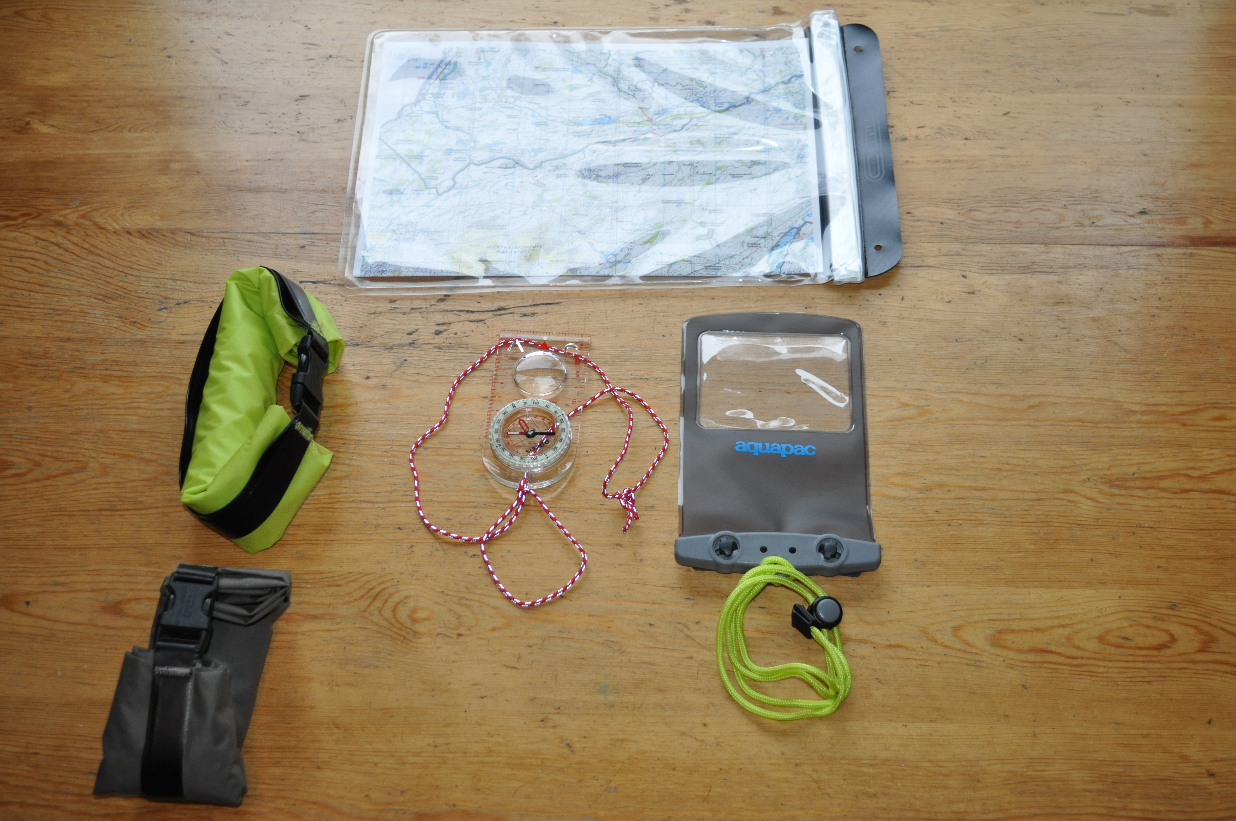 Kartta, kompassi ja sateelta varustautuminen tapahtuu kuvan osoittamilla vermeillä. Kartalle vedenpitävä dokumenttitasku Ortliebiltä. Aquapac puhelimelle sekä kaiken tekstiilin makuupussia myöten pakkaan Ortliebin kuivasäkkeihin. Kompassissa kannattaa olla paljon fosforia, jotta suunnistus onnistuu myös pimeässä.