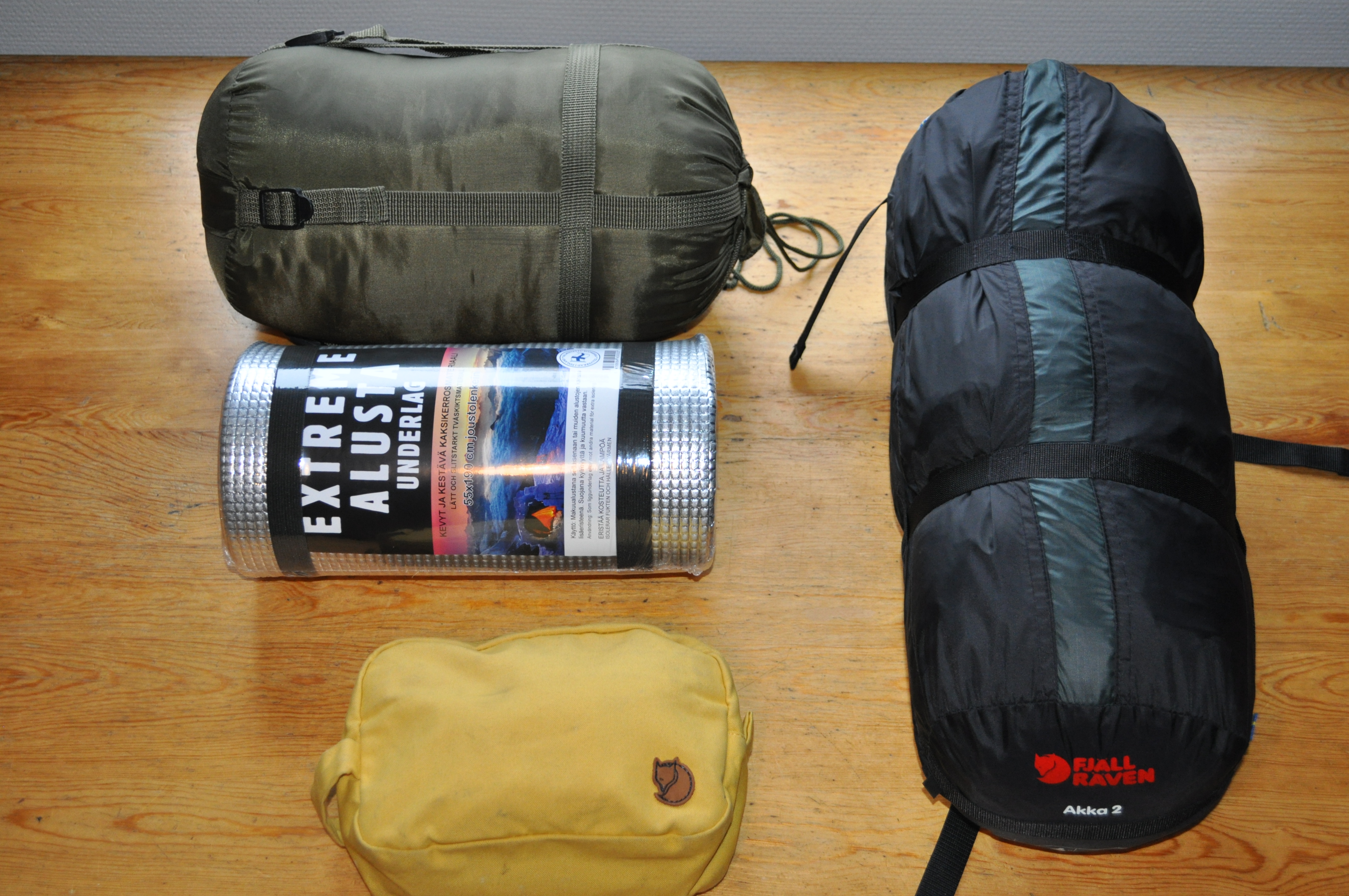 Nukkuminen on tärkeää retkellä, jotta virta riittää koko matkan ajaksi. Majoitteeksi tulee Fjällrävenin Akka 2, joka on tosin jo vanhaa mallistoa, mutta on toiminut luottopelinä. Makuualusta, joka kuvassa näkyy on yleensä minulla ainoastaan vara-alustana, jota voi käyttää myös tauoilla. Vaihtelen makuualustaa solumuovisen Savotan alusta, Thermarestin Trail Liten sekä Vauden Norrsken alustan välillä. Näiden lisäksi keliin sopiva makuupussi. Viimeisenä kuvaan laitoin hygieniabägin, jossa on EA tavarat, hammasharja yms.