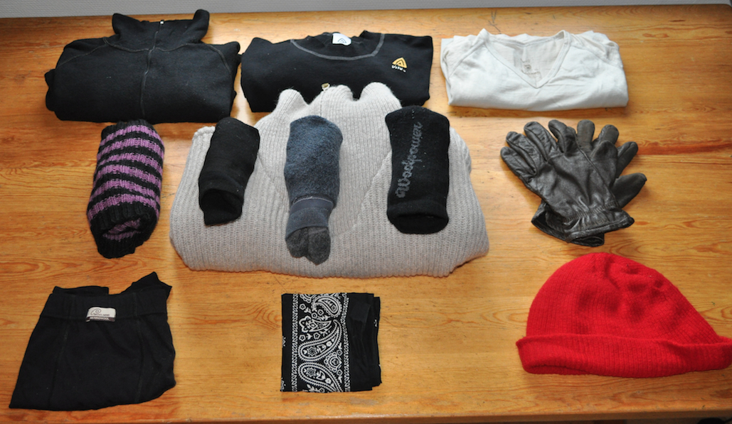 Pipo, hanskat ja kaulahuivi sekä paksu norjalainen villapaita ovat niin sanottua lämpökerrosta. Kuoritakki lähtee myös mukaan, joka on aina päällimmäisenä olipa alla mitä tahansa. Punnitsen vielä yleensä villapaidan ja kevytuntuvatakin välillä. Päätöksen teen sen jälkeen kun kamat ovat rinkassa ja näkee lopullisen painon.