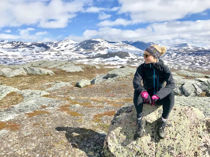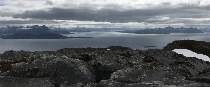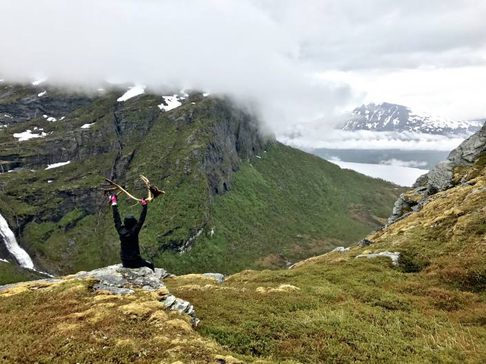 Lofootit jäi taakse ja matkalla pohjoiseen pysähdyimme Grovfjordissa. Kävimme avaamassa kesäkauden eräälle vaelluspolulle, sillä kukaan ei ainakaan vieraskirjan mukaan ollut käynyt sielä sitten viime kesän. Syykin selvisi varsin pian kun huomasimme polun olevan lumen ja vuoristopuron vallassa. Mutta kyllä aina ylös pääsee jos sinne haluaa. Kiipeilymoodi päälle ja menoksi 🙂 Fiilis oli aika huumaava ylhäällä pilvien seassa!