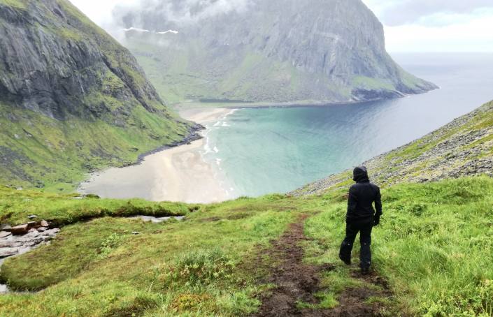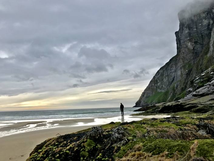Kvalvika Beach oli autio hiekkaranta teiden ulottumattomissa. Tunteroinen vaellettiin paikalle ihastelemaan aavaa merta.