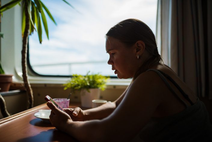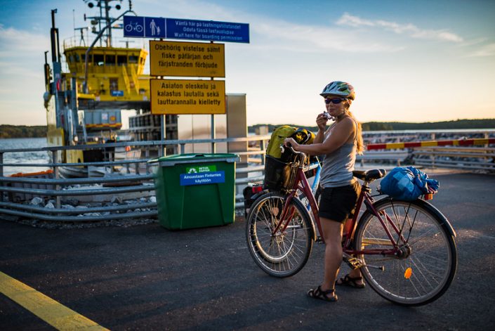 Nauvon lautta, ylitys Paraisten saarelta Nauvon saarelle. Katjalla on käytössään työmatkapyöräilyssä käyttämänsä, hyvin palvellut napavaihteinen pyörä ja tavarat on pakattu pyörän etukoriin ja tarakalle.