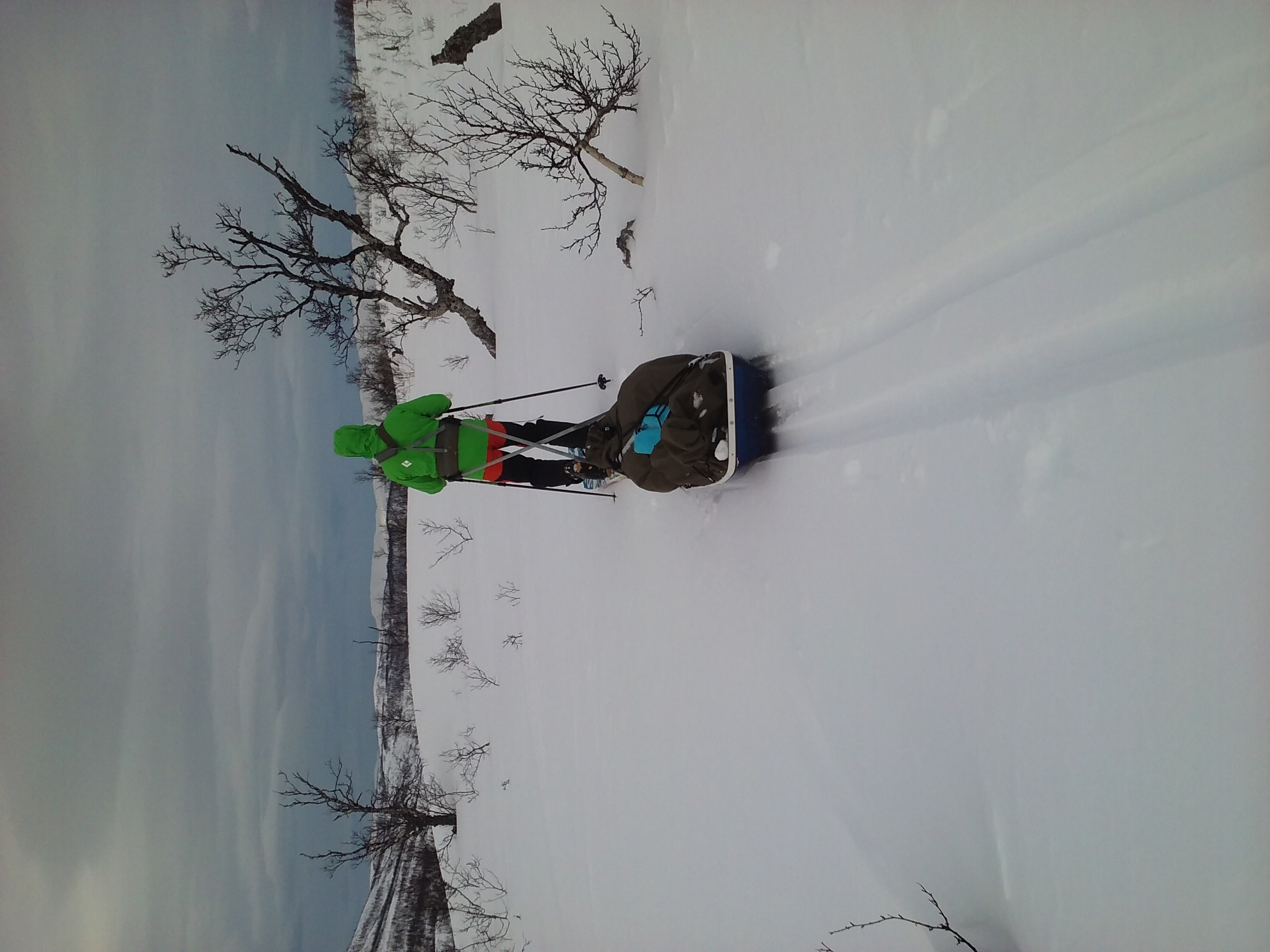 Aloitetaan perusasiaista: ahkio sekä sukset. Ahkion tulee olla riittävän tilava, vakaa ja lujatekoinen. Itselläni lähtee mukaan Hiking Travelin Isohitti-malli. Hiking Travelin ahkiot on testattu monessa käytössä eri retkikunnilla: niitä on vedetty pitkin pohjoismaita, Huippuvuorilla sekä myös Grönlannin jäätikön yli. Isohitin tilavuus on 450 litraa, joten kaikki tarvittava pitäisi mahtua mukaan. Aisat saa asennettua joko ristiin tai suoriksi maastosta riippuen.