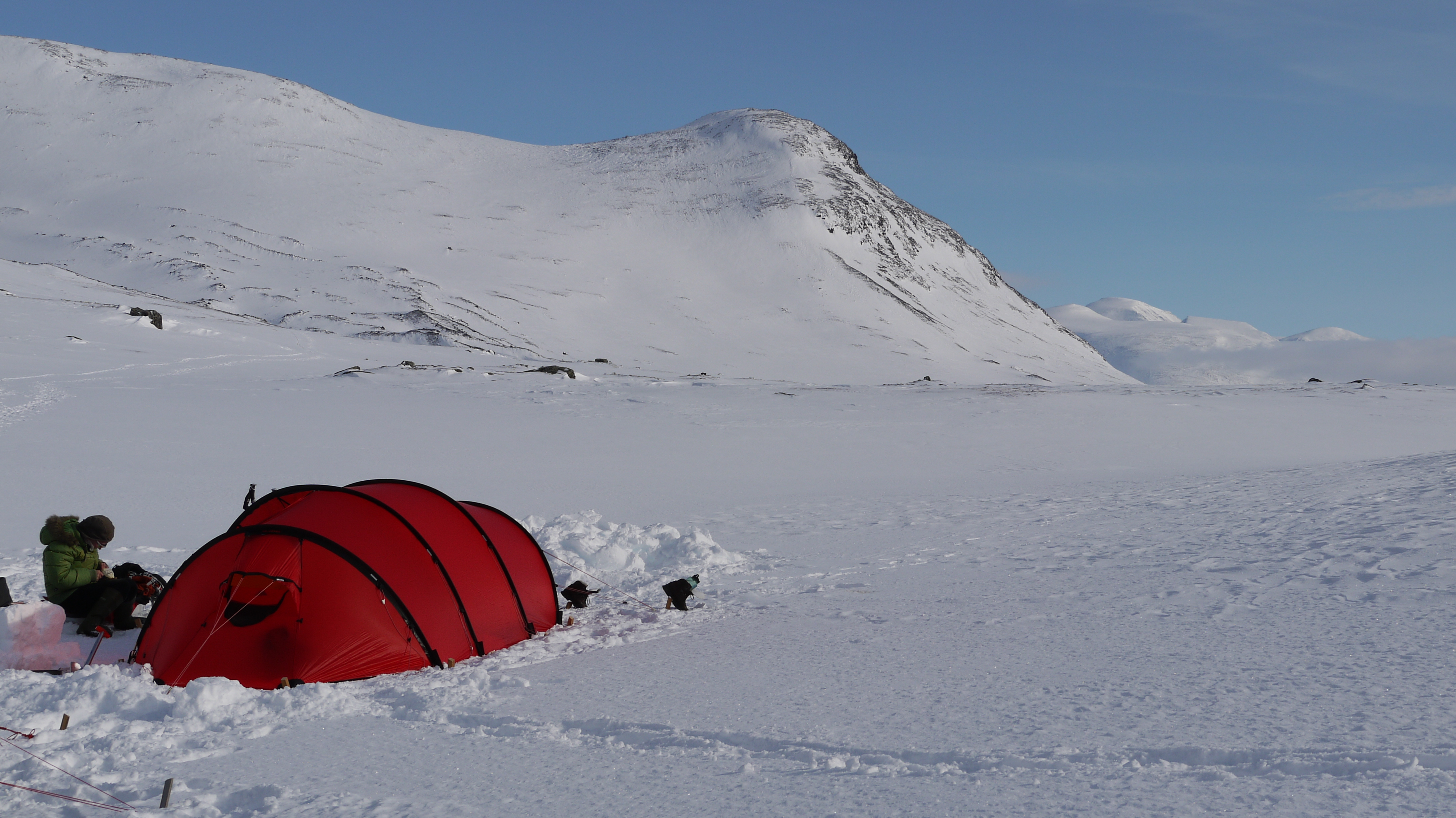 Sitten tärkeä asia: majoittuminen. Telttana reissussa on Hillebergin Kaitum 3 GT. Tilava asumus, etenkin tilava absidi, ja kestää kovempaakin keliä. Mukaan lähtee joka tapauksessa pari varakaarta. Perus maakiilat on korvattu omatekoisilla puisilla lumikiiloilla. Teltan lattiaa peittämään on nidottu yhteen kolme kevyttä Extreme -makuualustaa. Varsinaisen makuualustan virkaa hoitaa Expedin Downmat 7 ja makuupussina toimii vanha kunnon sargofagi, eli Marmotin CWM. Nyt saa pakkanen öisin painua huoletta -30 rapiammalle puolelle, ei tunnu missään.
