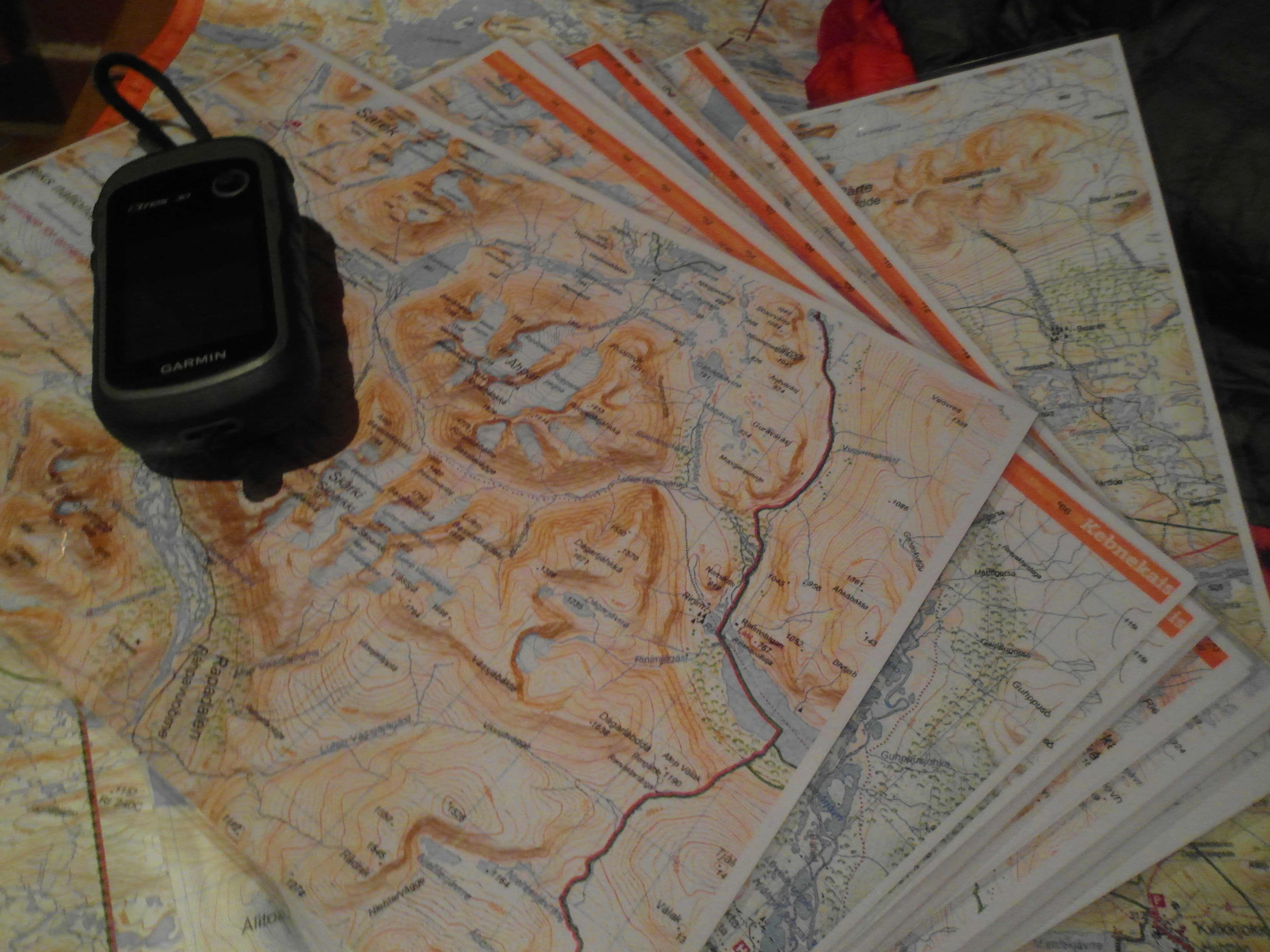 Kartoista on otettu alueittain A4-kokoiset kopiot, jotka on isketty laminaattiin. Näin päällystettyä karttaa on helppoa käsitellä huonossakin säässä. Karttojen kaverina mukana on tietysti aina perus karvalakki kompassi näyttämässä suuntaa. Sen liäksi matkalaiset oikealla polulla ja ajan tasalla pitävät vielä Garminin Etrex 30 käsi-GPS varustettuna Sweden V4 PRO-Norra Norrand -kartalla sekä ranteesta löytyvä Garmin Fenix 3. Jos nyt eksyy niin täytyy vika olla jo miehissä.