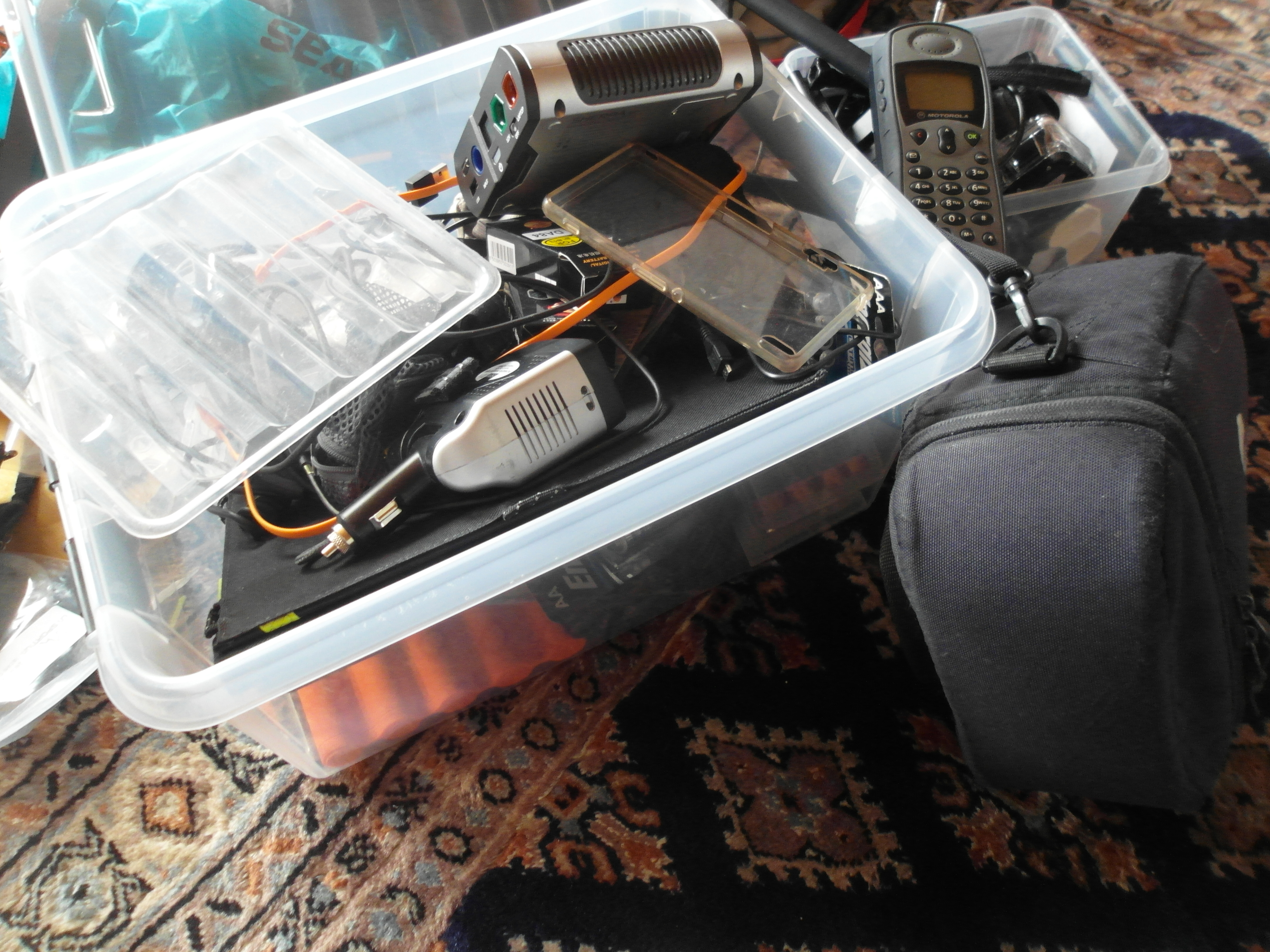 Elektoniikkapuolta mukaan lähtee myös ihan toivoton määrä…yli 6 kg. On muutama kamera, GPS, valaisimia, MP3, piipparit, kellot, kännykät ja satelliittipuhelin. Meitä on reissussa vain kaksi ja paikoin olemme pitkiä aikoja katveessa, jolloin satelliittipuhalin on ainoa keino saada yhteys ulkomaailmaan, jos jotain sattuisi. Ja näihin kaikkiin tietysti akut sekä aurinkopaneeli ja laitteet näiden akkujen lataamiseen.