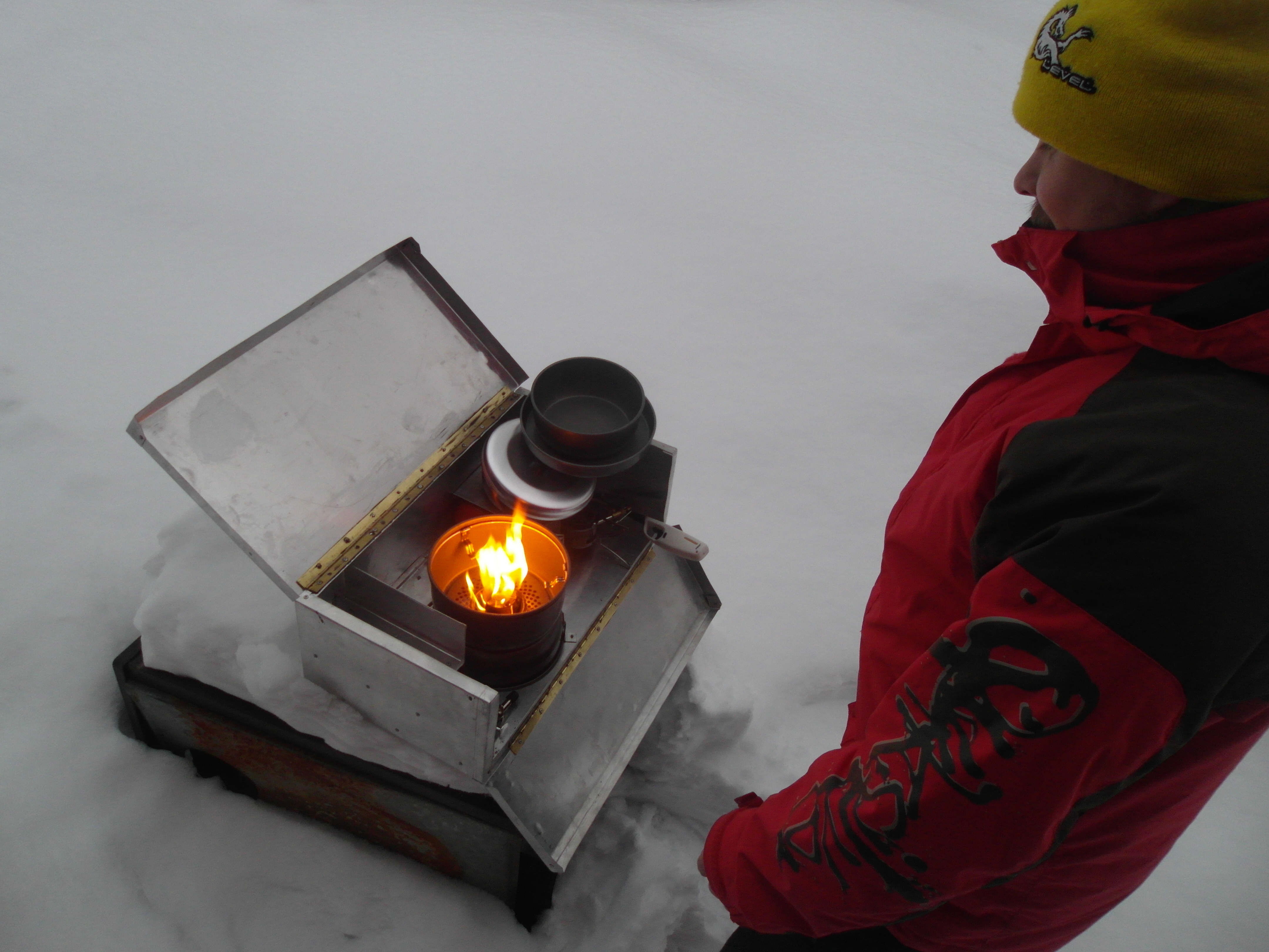 Ruoan valmistukseen on mukana kaksi bensakeitintä. Kovalla pakkasella pulloissa oleva kaasu alkaa hyytyä, jolloin on aika siirtyä järeämpään polttoaineeseen, jos mielii nauttia ruokansa lämpimänä. Keittimiä varten on valmistettu keitinlaatikko, jossa molemmat kätevästi kulkavat. Leiriin tultaessa ei tarvitse muuta kuin nostaa vain koko komeus sisään (tai hyvällä säällä kokkailla ulkona) ja alkaa lämmitellä poronkäristystä ja teevettä.