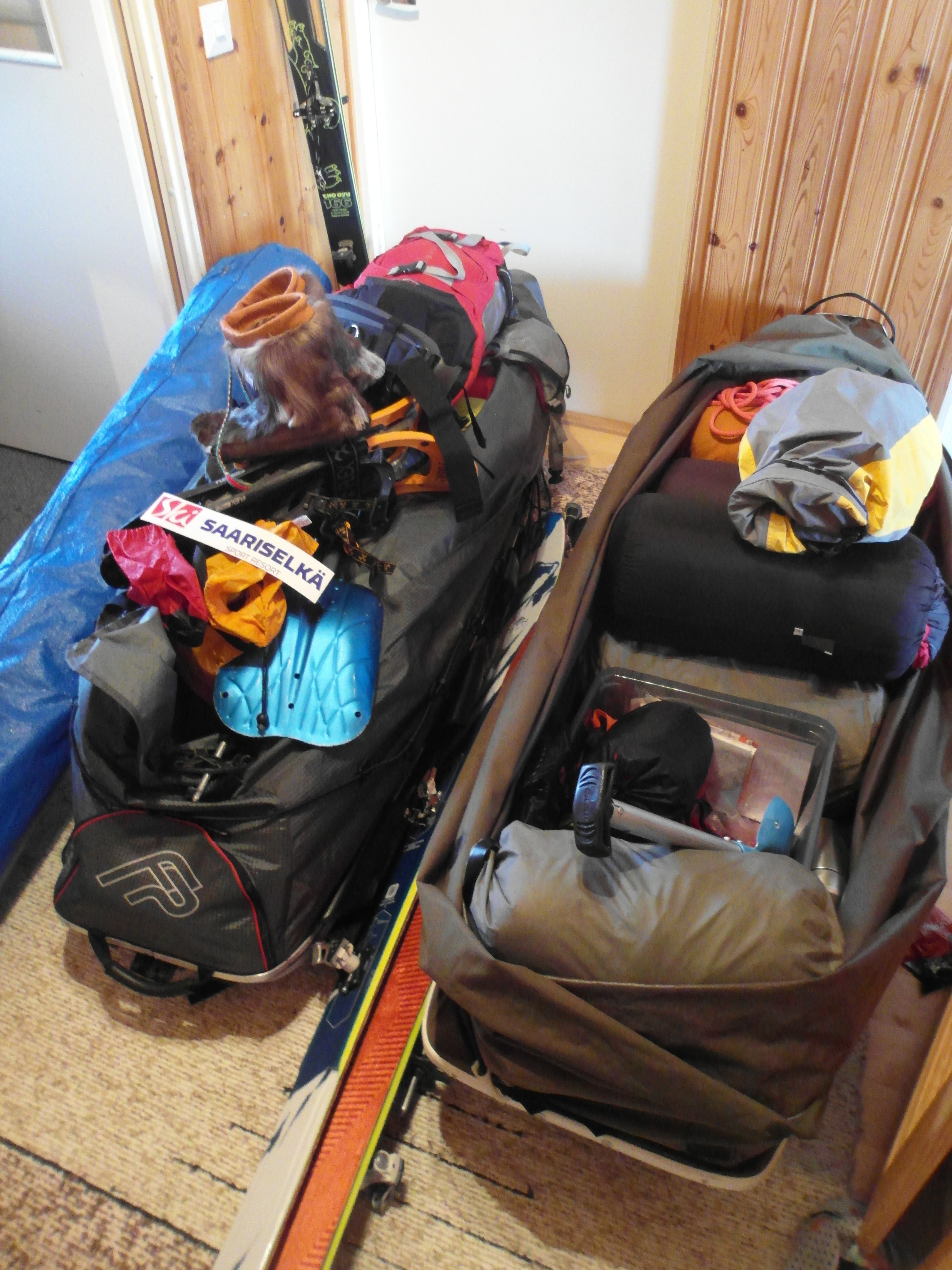 Varsinaisen vaelluksen lisäksi meillä on myös tarkoitus huiputtaa useampi tunturi ja osa näistä reissuista vaatii kiipeilyvarustusta. Kaksi huiputuskeikkaa on myös suunniteltu niin, että vietämme yön ylhäällä vuorella. Näitä pistoja varten mukaan pakataan pieni Marmotin vuoristoteltta, kevyet makuuupussit (Marmot Plasma 15) sekä kevyet alustat (Thermarest Neonair X-therm). Mukaan lähtee myös pieni kaasukeitin sekä muutama purkki talvikaasua. Kaikki tuovat tietysti lisää painoa ahkioon, mutta toimivat samalla myös varavarusteina, jos esimerkiksi Downmat menisi rikki.