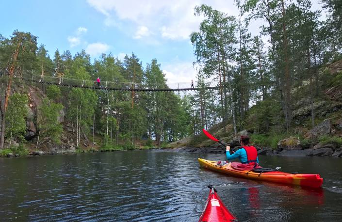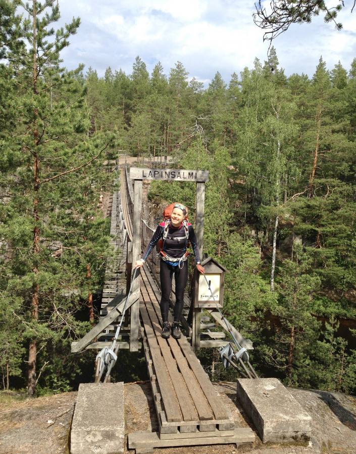 Repoveden kansallispuisto sijaitsee Kouvolan kupeessa tarjoten hienot puitteet niin melonta- kuin vaellusretkille. Jylhät kalliomaisemat, riippusillat ja lukuisat järvet kuuluvat tämän paikan aarteisiin. Repovedelle pääsee nopeasti Etelä-Suomen ruuhkakeskuksista ja se onkin oiva kohde lyhyelle viikonloppureissulle. Turusta ajomatkaa kertyy reilu neljä tuntia ja Helsingistä vajaa kolme tuntia. Myös ensivuoden suunnistuksen Sm-keskimatka kilpaillaan kansallispuiston lähimaastoissa, joten suosittelen kaikkia sinne suuntaavia poikkeamaan upeilla poluilla kilpailu- ja leirimatkojen yhteydessä!