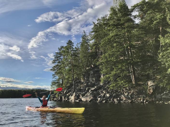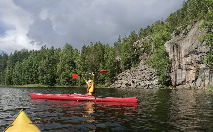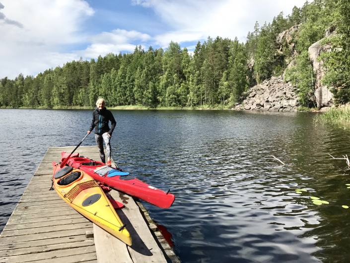– Repovedellä on paljon pitkiä ja matalia laitureita, joille rantautuminen on helppoa. Kajaakin voi nostaa kevyesti laiturille evästauon ajaksi.