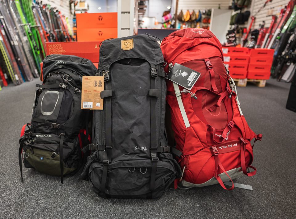 Kuvassa vasemmalta oikealle: Osprey Aether Plus 85, Fjällräven Kajka 75 ja Osprey Ariel 55 AG.