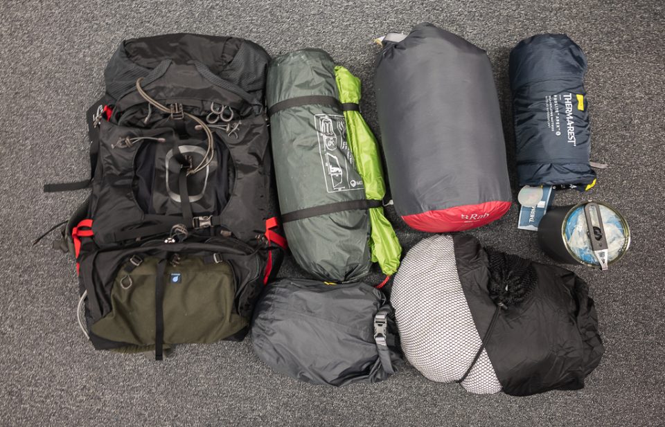 Näillä varusteilla rinkka menikin jo aivan täyteen ja majoite pitää kiinnittää joko rinkan ulkopuolelle tai sen kantaa mahdollinen telttapari.