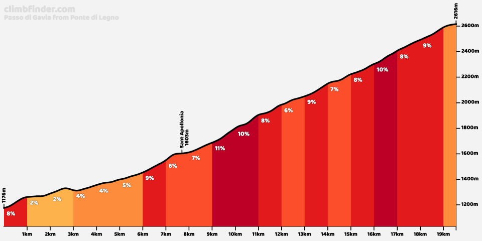 Jonna Mortirolon päällä, nousu on yksi Alppien vaikeimmista ja tyhjentää jalat sopivasti ennen loivempaa, mutta pidempää Gavian nousua!