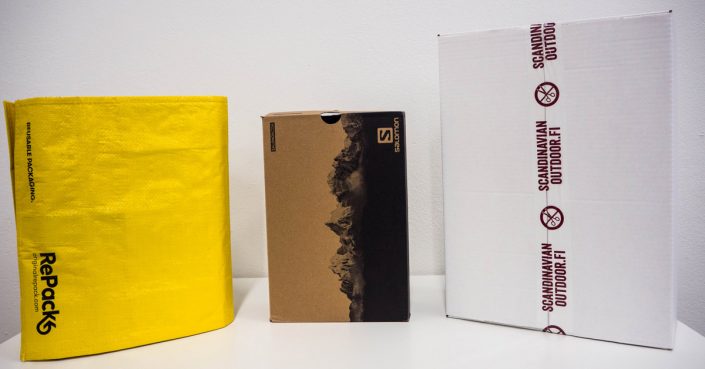 RePack -pakkauksia on olemassa kolmessa eri koossa, joten suurin osa valikoimamme tuotteista mahtuu näihin pakkauksiin. Kuvan RePack -pakkauksiin on pakattu vasemmalta katsottuna seuraavat tuotteet: Haltin naisten Fleece, keskimmäiseen Salomonin polkujuoksukengät ja oikean puoleiseen Jack Wolfskinin rinkka. Kuvan etulaidassa näätte RePack -pakkauksen tyhjennettynä ja taitettuna kirjeen muotoon. Tässä muodossa pakkaus on kätevä sujauttaa postilaatikkoon, josta se jatkaa matkaansa kohti uutta elämää.