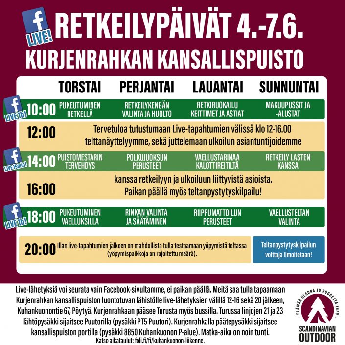 Yrityksemme täyttää tänä vuonna 50 vuotta, ja sen kunniaksi lanseeraamme uudelleen vanhat kunnon Retkeilypäivät! Kokonaan uudistettuja Retkeilypäiviä vietetään torstaista sunnuntaihin 4.-7.6.2020. Retkeilypäivien ajan on luvassa Facebook-livelähetyksiä Kurjenrahkan kansallispuistosta kaksi kertaa päivässä klo 10 ja klo 18. Telttakylään on mahdollista tulla tutustumaan livelähetysten ulkopuolella klo 12-16. Ensisijainen osallistumistapa on kuitenkin Facebook-livelähetykset, joihin voit tulla mukaan esimerkiksi puhelimellasi omasta lähimetsästä!
