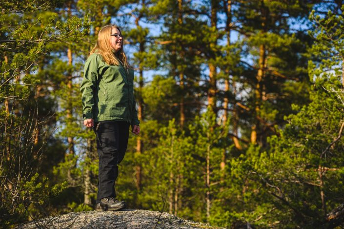 Johannalla on yllään Sastan Aava -malliston retkeilytakki ja -housut.